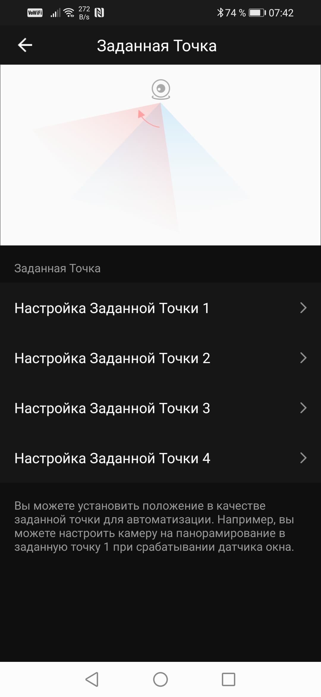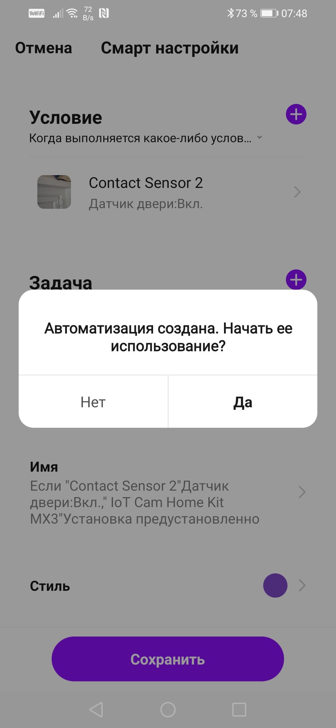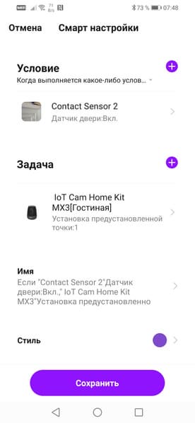 Следующая полезняшка, о которой необходимо рассказать — автоматизация, которую дарят Смарт-сцены. Представьте ситуацию: сработал датчик открытия двери. Вам, разумеется, захочется узнать — кто же, собственно, является нарушителем. Очень просто. Несколько тычков пальцем в нужные пункты, и теперь при каждом срабатывании этого датчика камера станет поворачивать свой объектив в нужную сторону, тем самым нарушитель непременно будет записан.