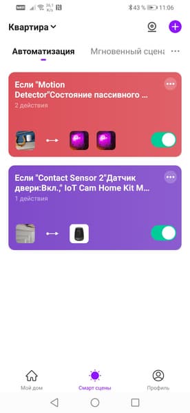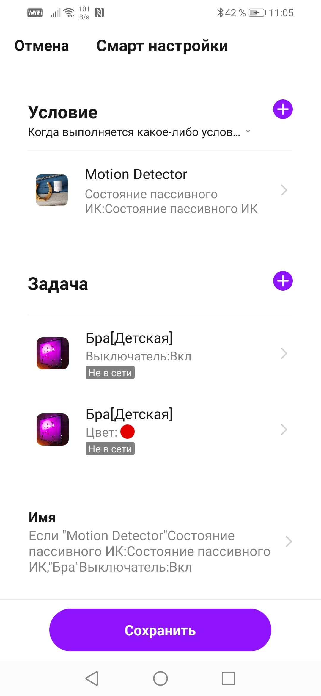 Исключительно полезная функция! Кстати, с помощью таких смарт-сцен датчики могут сообщать не только о вторжении, но и о падении уровня заряда своих аккумуляторов. Более того: работу каждого датчика, который включен в Умный дом Hiper, можно связать с работой любого другого устройства, которое функционирует в системе. Так, мы без труда заставили лампочку, которая вкручена в бра, включаться красным цветом, если в коридоре обнаружено движение.