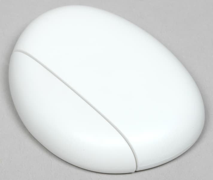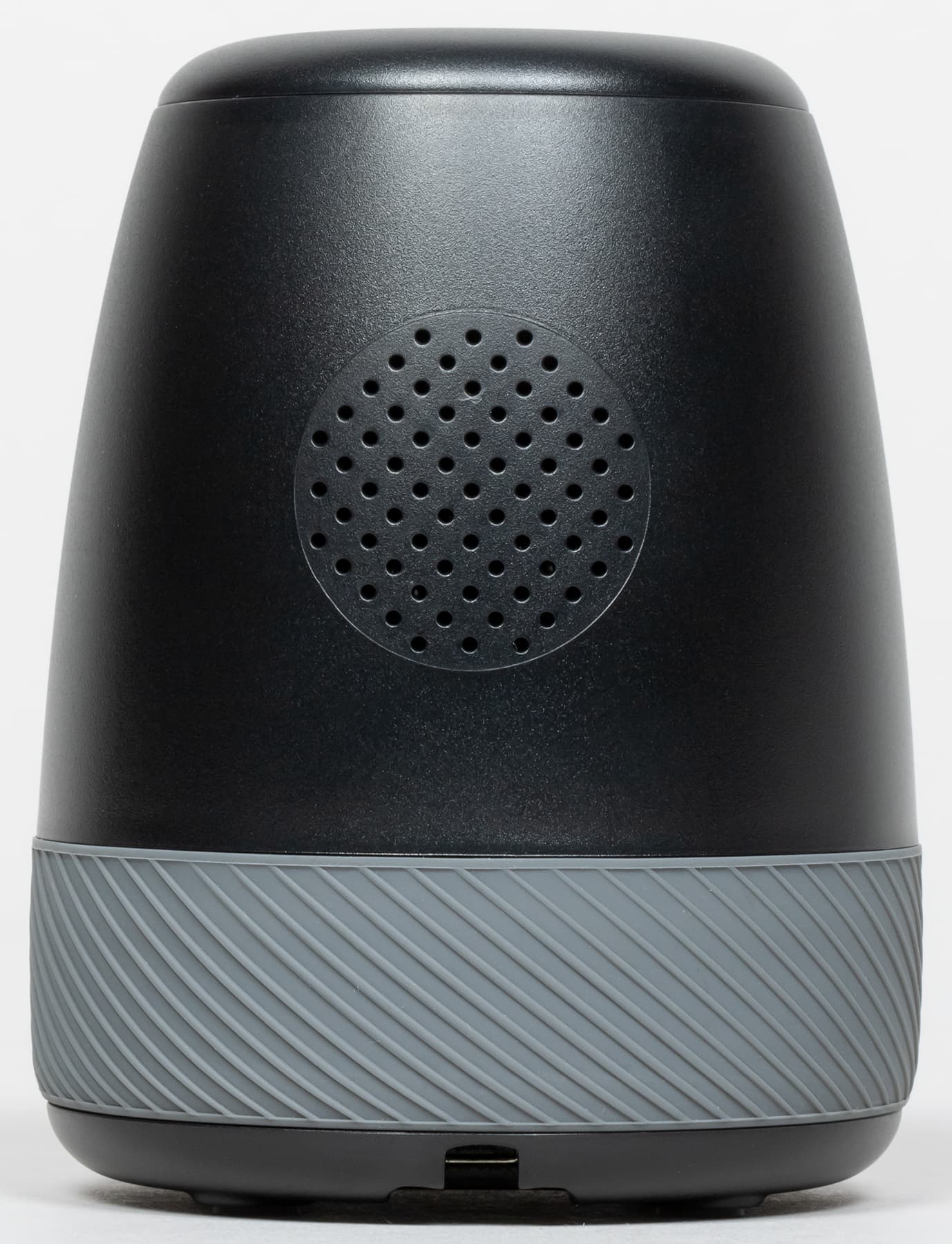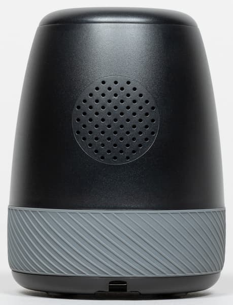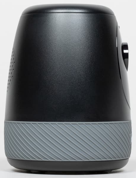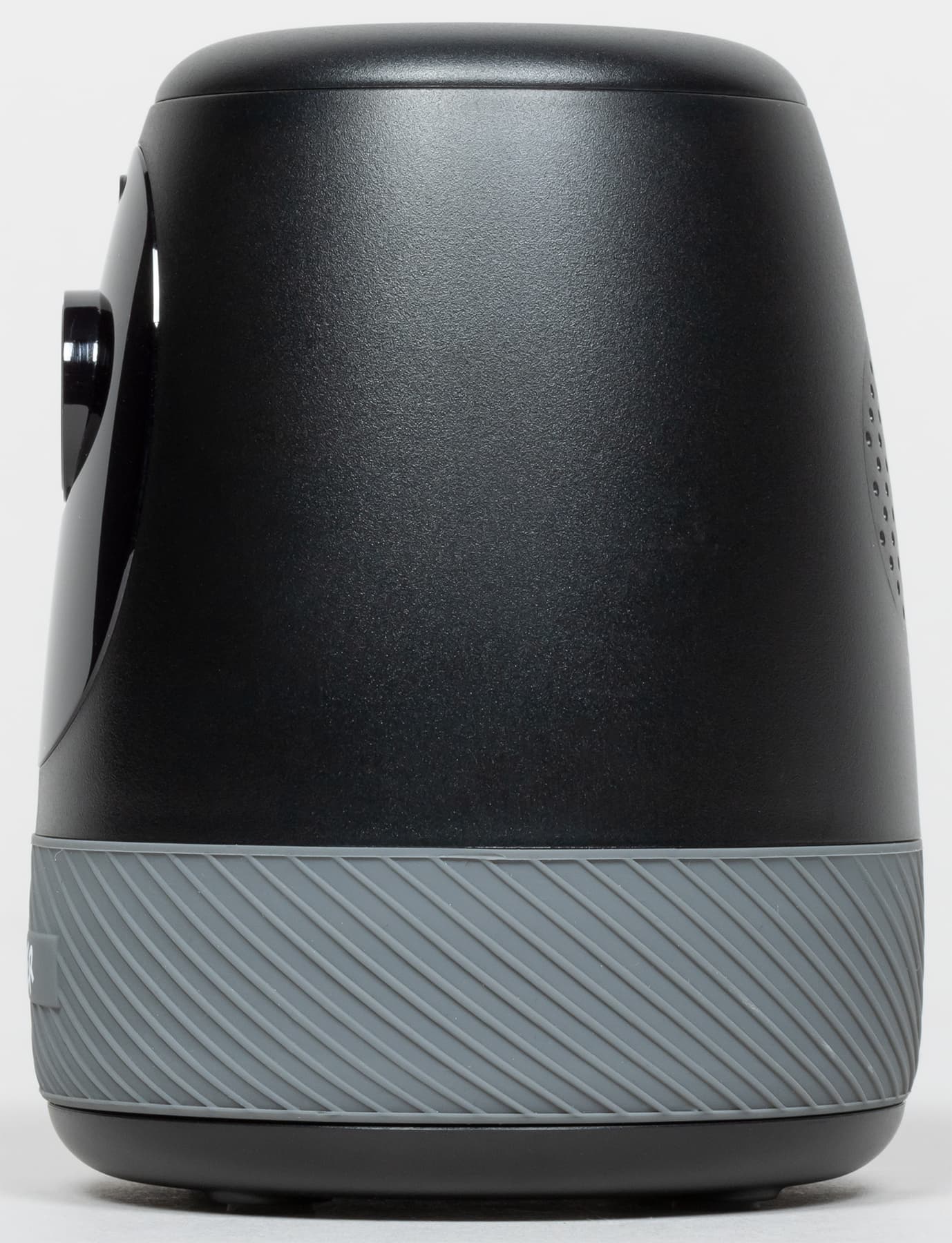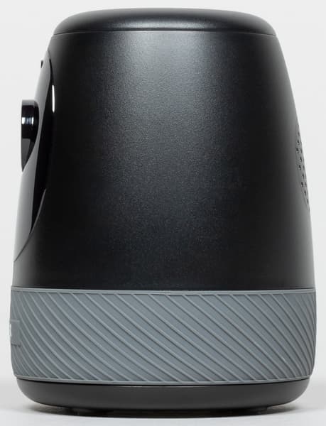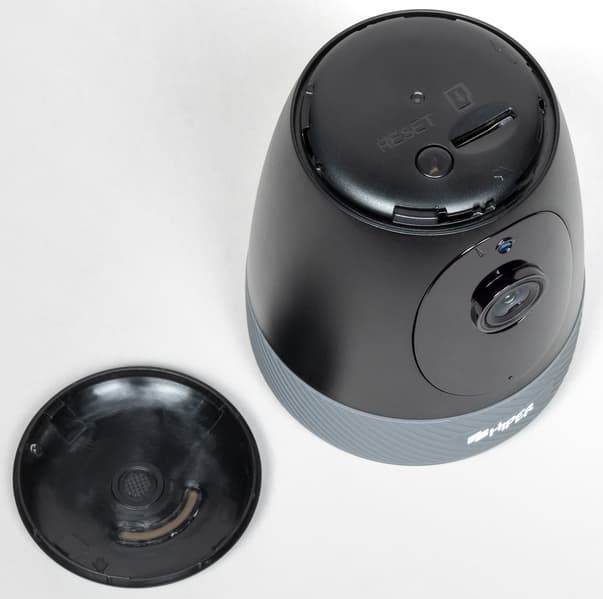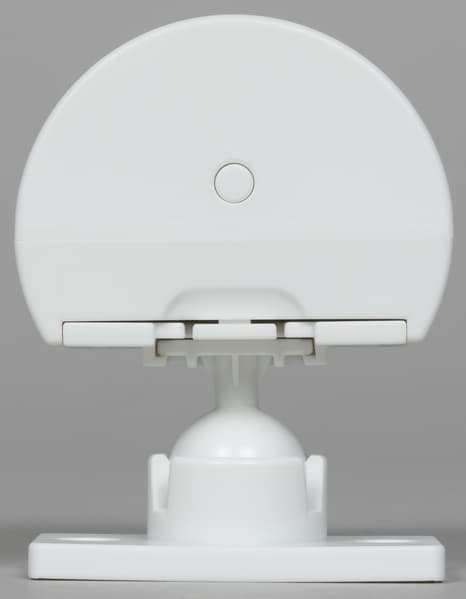 Высота неподвижного основания едва достигает 8 мм, а зазор между основанием и поворотным корпусом практически незаметен. Лицевая сторона корпуса содержит оптико-электронный блок с объективом, датчиком освещенности и скрытыми за темным пластиком инфракрасными светодиодами, работающими в темноте. На задней стороне находится решетка встроенного динамика.