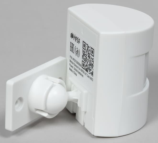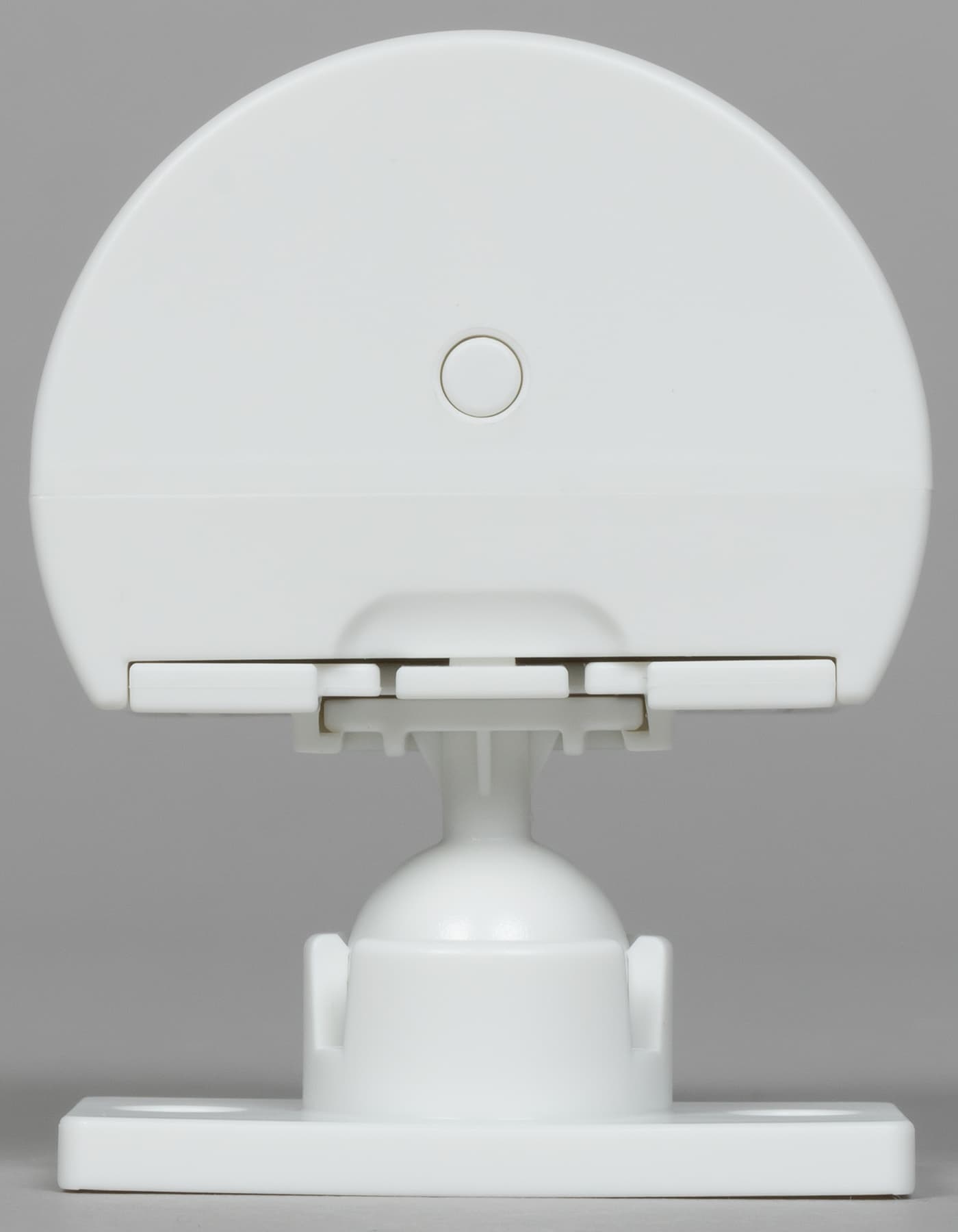 Шаровое крепление позволяет повернуть и наклонить прибор так, чтобы захватить нужную область обзора контроля. Например, коридор или дверной проем. Из органов управления — единственная кнопка, расположенная на дне корпуса. С ее помощью производится установка датчика с включением в систему Умного дома.