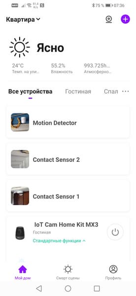 После того, как датчики подключены, их названия и иконки можно подредактировать. Разрешается даже сфотографировать датчик, с тем чтобы получившееся фото отображалось вместо малоговорящей иконки. Очень удобно: глянул на миниатюру, и сразу понимаешь, где именно расположен тот или иной датчик.