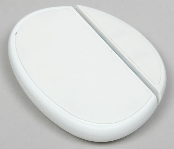 В отличие от большинства магазинно-офисных датчиков движения, этот прибор имеет миниатюрные габариты и не перекрывает собой дверные косяки или потолочные карнизы. Чуть выше фирменного логотипа находится синий светодиод, который во время работы просвечивает сквозь нежно-молочный пластик корпуса.