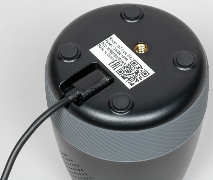 Дно площадки оснащено четырьмя короткими резиновыми ножками, которые предотвращают скольжение прибора на гладких поверхностях. Здесь же расположено углубление с разъемом Micro-USB, через которое камера получает питание. Обратите внимание на резьбовое штативное отверстие. Это ценнейший узел, с помощью которого камеру можно капитально прикрепить к любой поверхности, хоть к потолку.