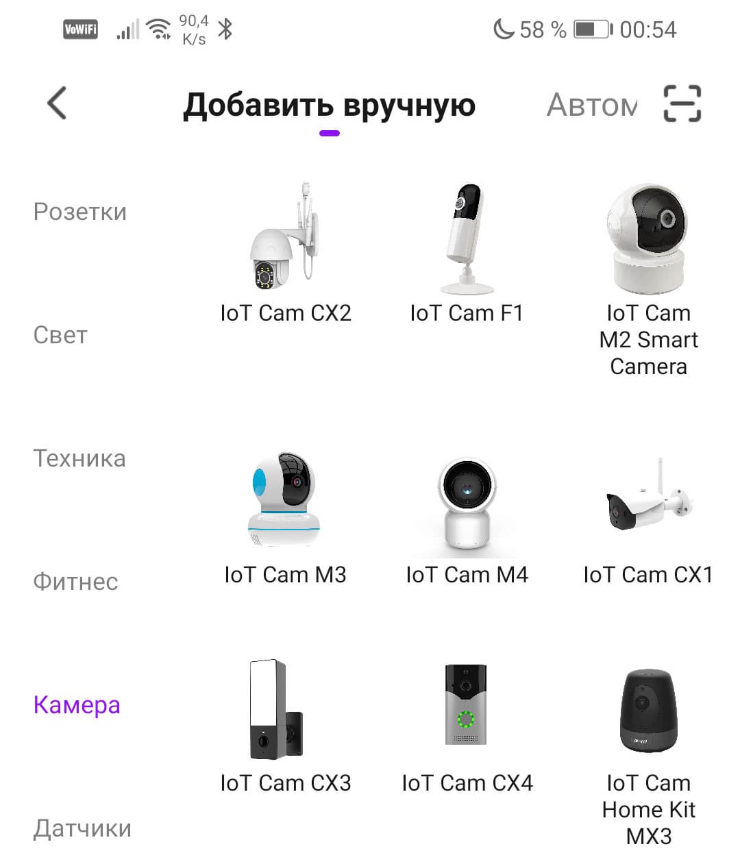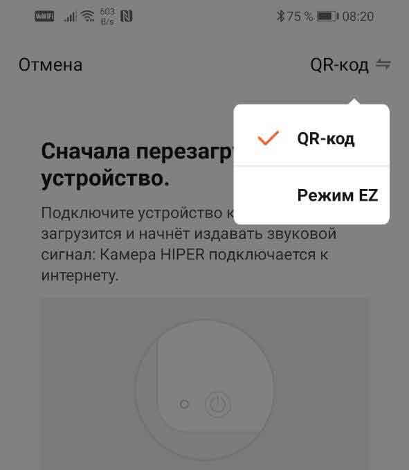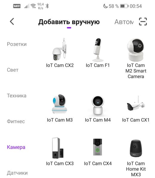 В приложении нужно нажать кнопку с плюсиком, которой добавляются новые устройства, выбрать пункт Камера, и отыскать интересующий аппарат, IoT Cam M4. Вот он, в центре. Запустится модуль подключения, где в правом верхнем углу имеется выпадающий список. Тут желательно выбрать пункт QR-код.