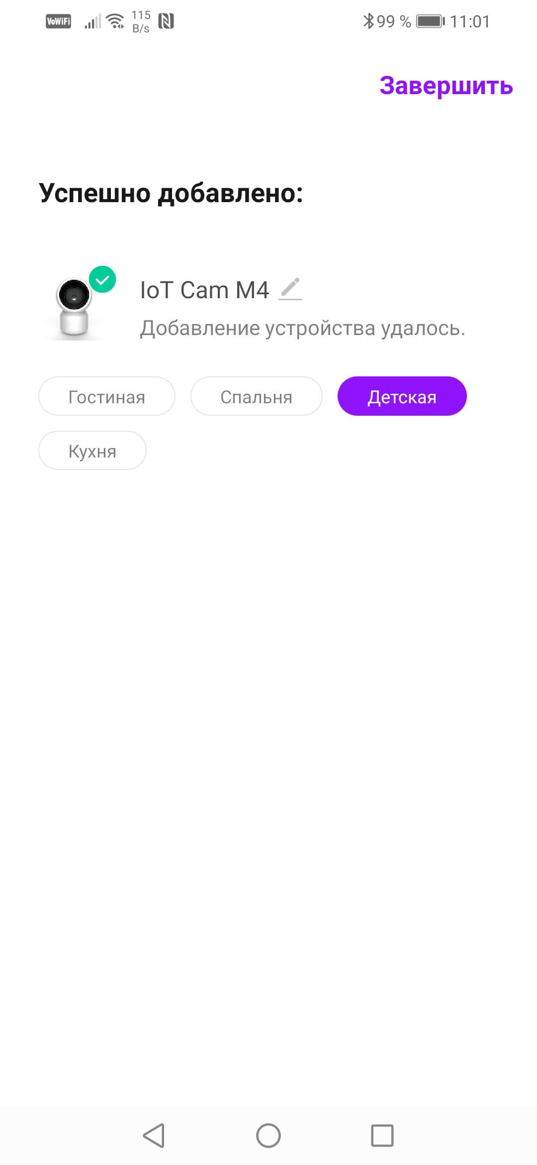 Далее как по маслу. Показав камере QR-код, сформированный программой и отображающийся на экране устройства, вы тем самым передадите ей информацию о Wi-Fi-сети, к которой требуется эту камеру подключить (подразумевается, что и смартфон в настоящее время подключен к этой же точке). Через несколько секунд аппарат, оповещая женским голосом о текущих этапах, завершит подключение и пользователю будет предложено выбрать помещение, в котором установлена камера.
