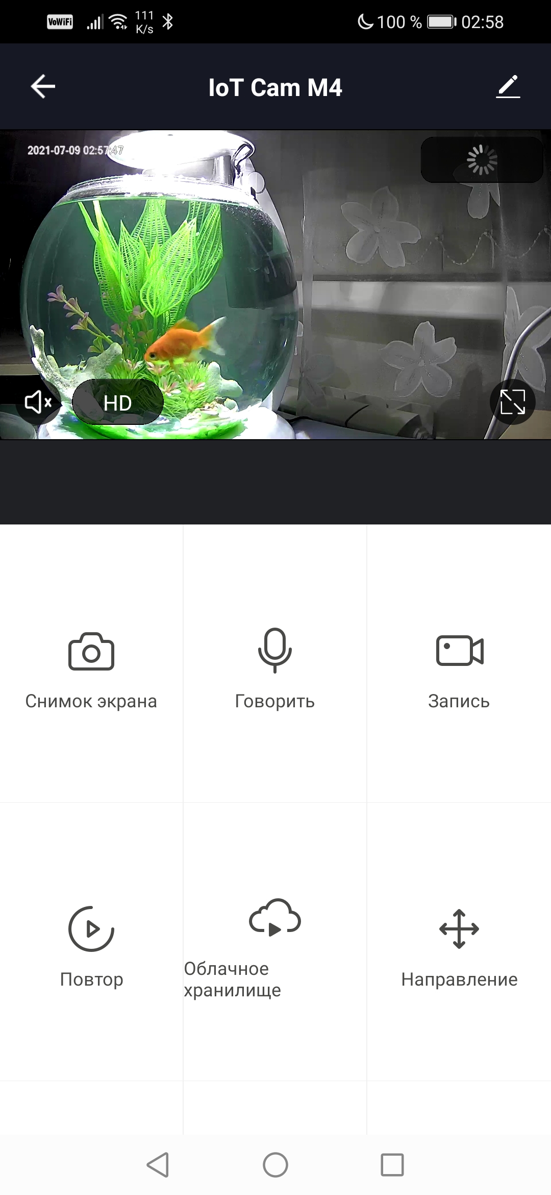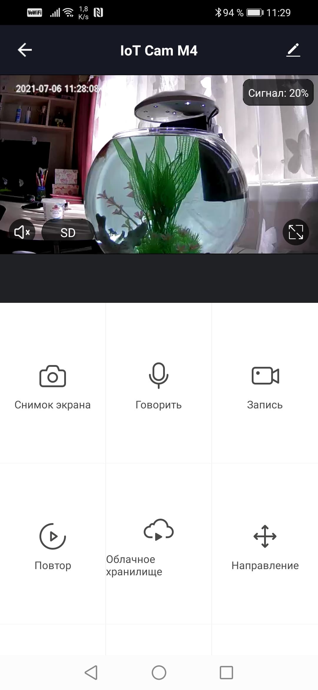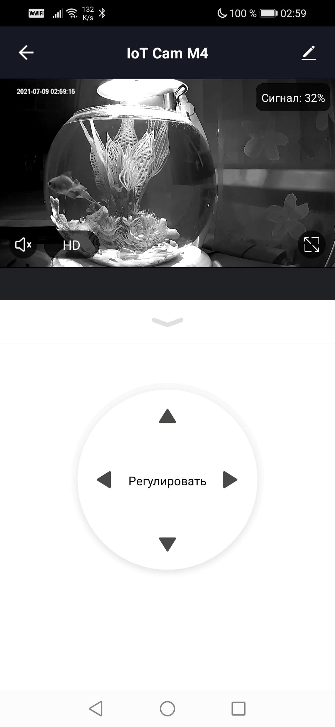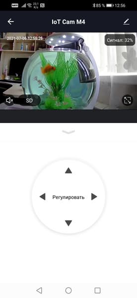При наличии достаточной освещенности камера способна давать яркое насыщенное изображение. Хватает слабого ночника, в данном случае — подсветки аквариума. Если же камеру принудительно перевести в ночной режим — включится инфракрасная подсветка и картинка станет черно-белой. Мощности инфракрасных светодиодов хватает, чтобы подсветить комнату небольших размеров.