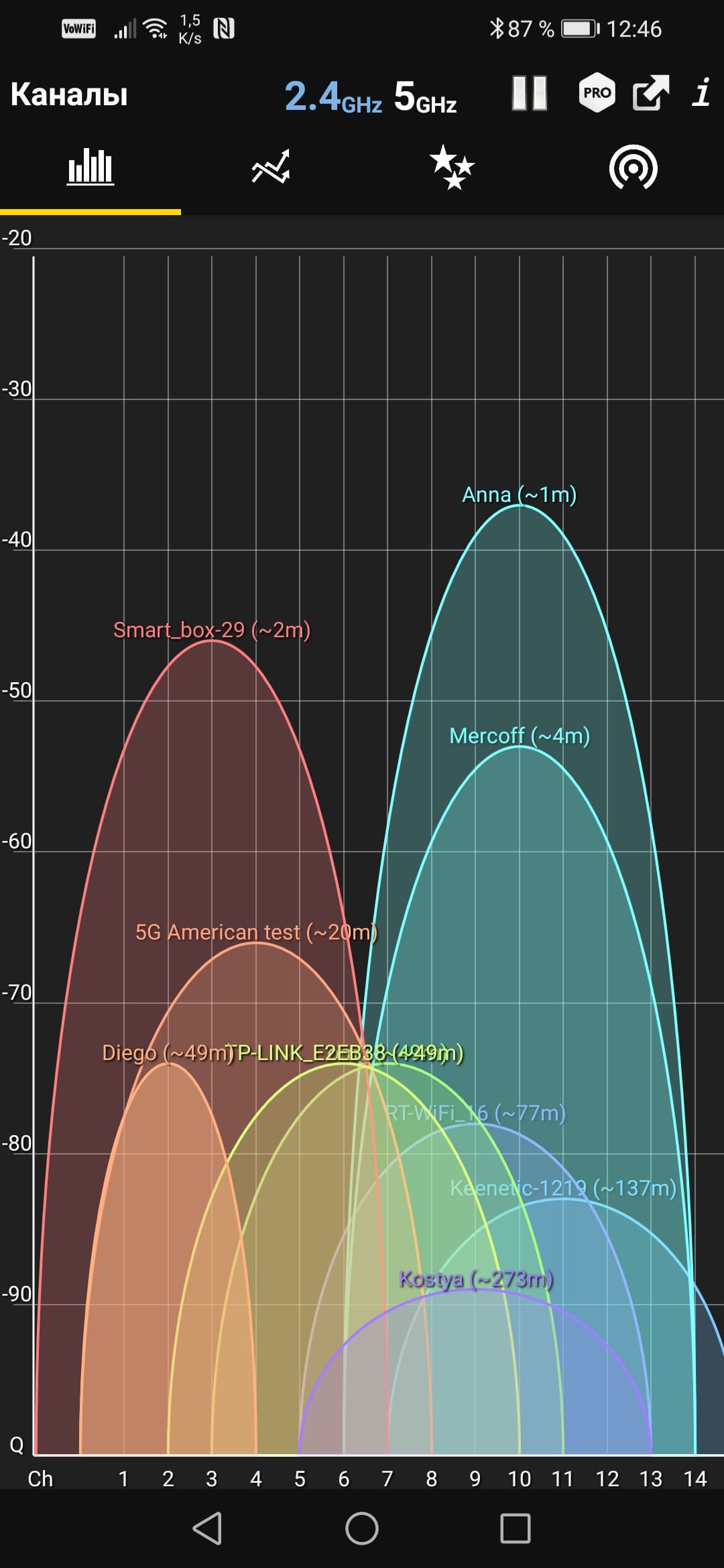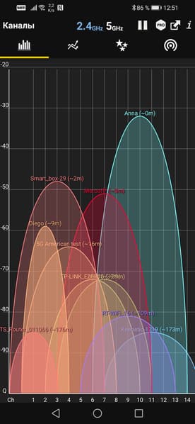 Устранить проблему помог специалист компании Hiper IoT, подсказавший следующий лайфхак. Запустив на смартфоне программу Wi-Fi Analyzer, мы без удивления обнаружили, что на канале роутера, к которому мы пытаемся подключить камеру (название канала Anna, самый высокий пик голубого цвета), «сидит» второй роутер, размещенный в этой же квартире. Присутствует и множество соседских роутеров, которые теоретически тоже могут мешать устойчивой связи камеры с маршрутизатором. Разумеется, мы тут же изменили канал у второго, мешающего роутера. Картина изменилась радикально.