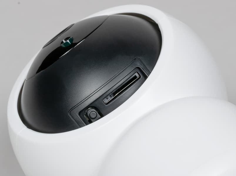 Но тут мы видим исключение: часть электроники, не связанной с оптикой, находится в поворотном блоке. Например, встроенные микрофон и динамик, служащие для обратной аудиосвязи, а также слот карты памяти, упрятанный в нижнюю часть блока камеры и обычно находящийся вне поля зрения.