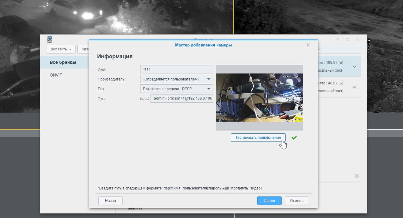 По каким-то причинам нам не удалось «договориться» с камерой по стандартам ONVIF, зато получилось вычислить адрес ее RTSP-вещания с помощью этого сервиса, после чего видеопоток с камеры благополучно открылся в домашнем комплексе наблюдения Synology. Таким образом, камеру можно использовать в составе сторонних систем наблюдения, пусть и с такой ограниченной функциональностью.