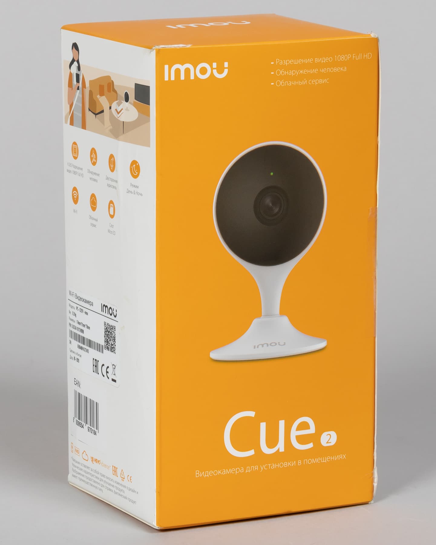 Камера упакована в традиционную для Imou оранжево-белую коробку с русскоязычным описанием содержимого.