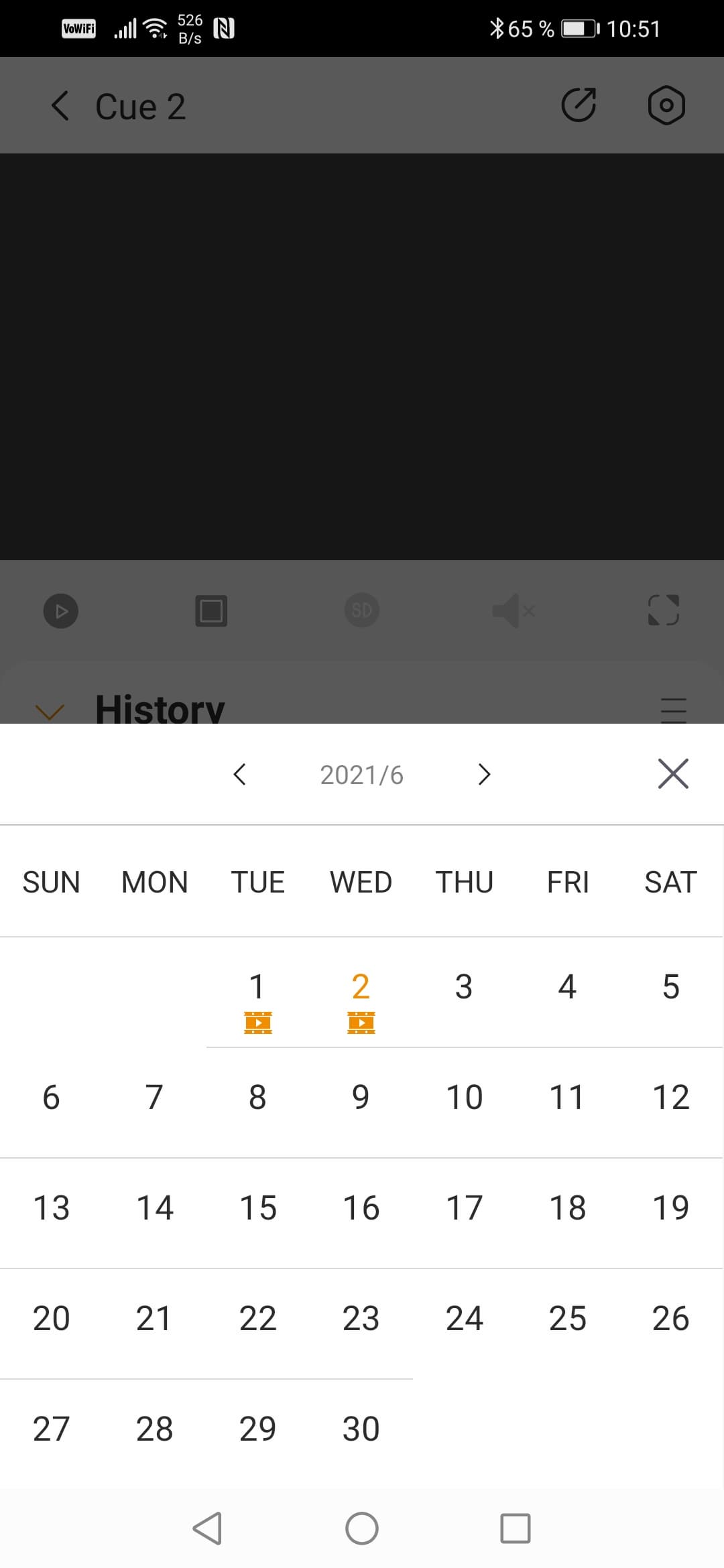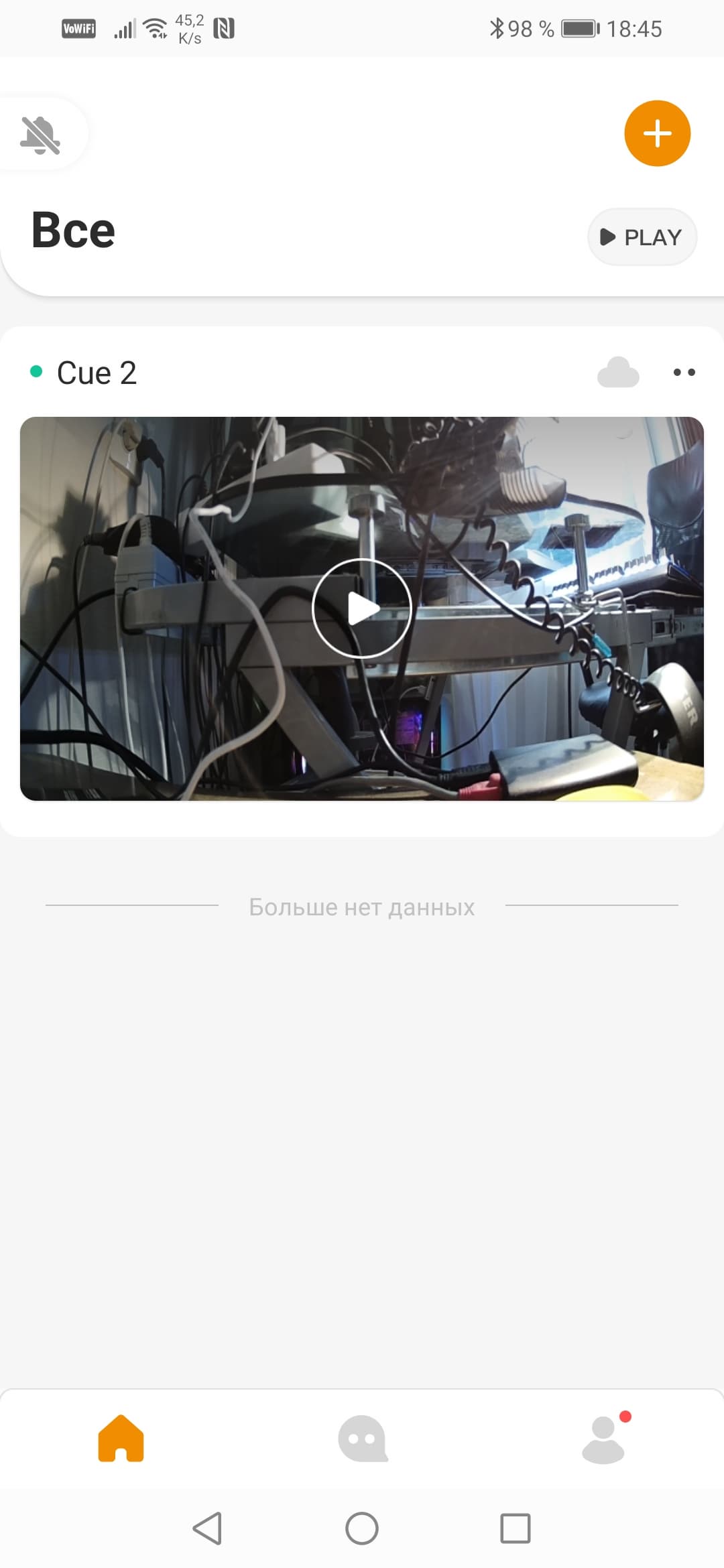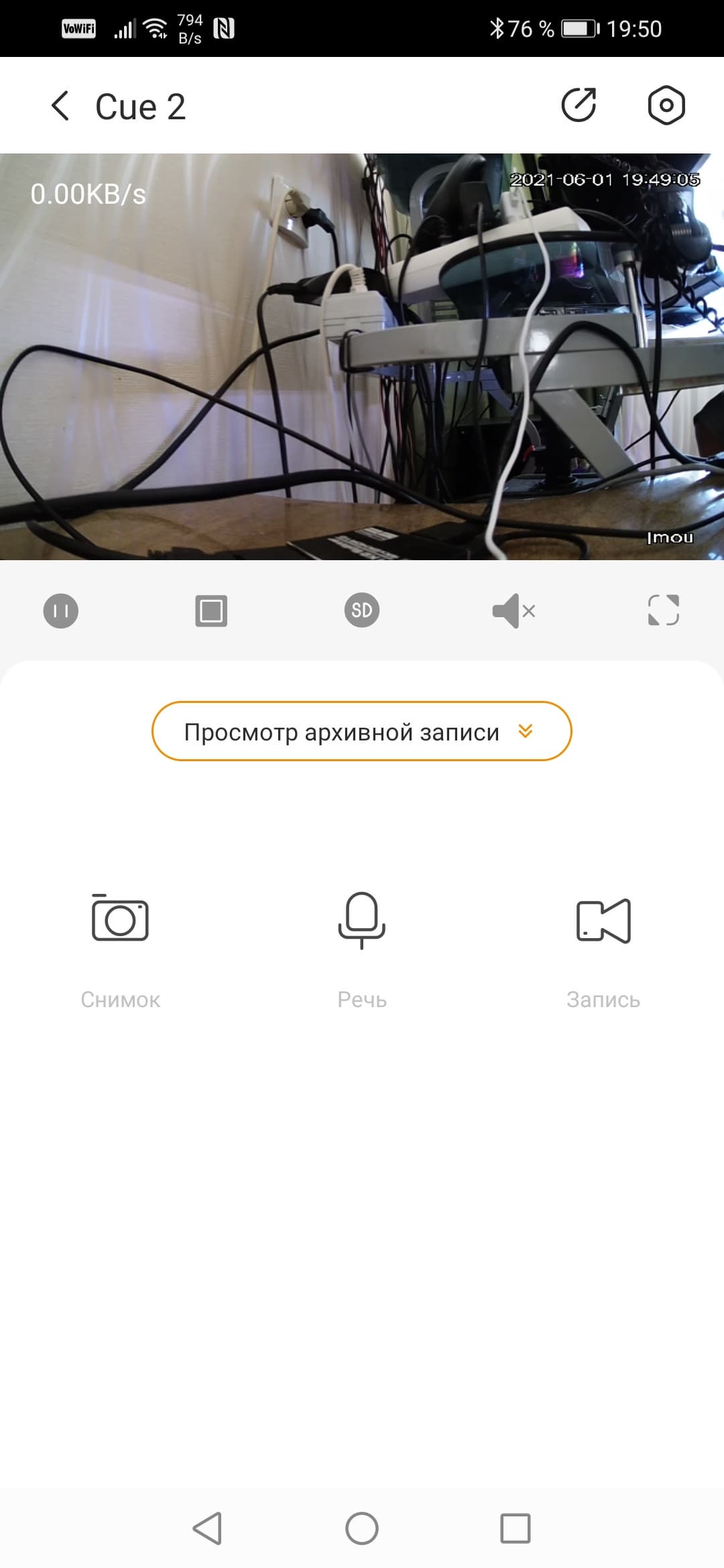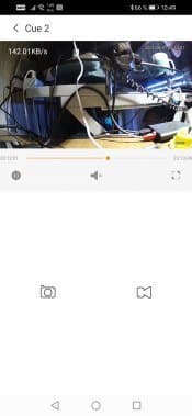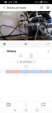 Окно просмотра живого видео отображает поток без задержек, трансляция может работать в как в обычной ориентации, так и в альбомной. Поверх картинки выводится текущий битрейт, передаваемый с камеры на смартфон. Важнейшая функция — просмотр архива. Он возможен в двух вариантах: перемещением по таймлинии, на которой оранжевыми блоками выделены события (движение в кадре, звук и т. д.), либо выбором конкретной даты с последующим просмотром ролика.