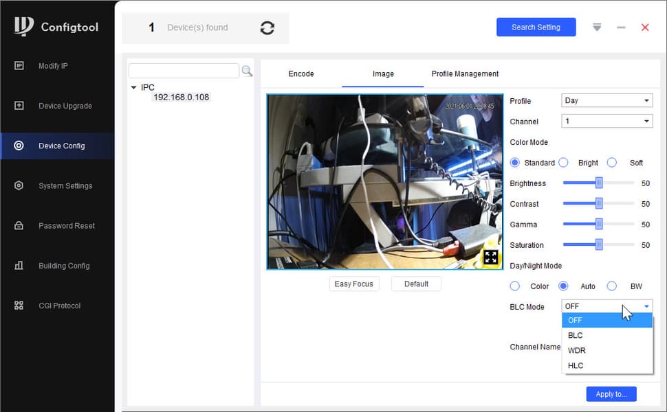 Гораздо более глубокие настройки камеры оказываются доступны только в фирменном приложении ConfigTool для ПК, которое устанавливается с помощью универсальной оболочки ToolBox. Здесь уже разрешается изменить размер кадра для каждого потока (основного и дополнительного), битрейт и даже кодек. А в секции параметров изображения имеются детальные настройки экспозиции с возможностью задействования таких важных функций, как BLC (компенсация задней засветки), WDR (расширенный динамический диапазон) и HLC (компенсация яркой засветки). Между прочим, эти три технологии — эксклюзивная «фишка» всех камер Dahua.