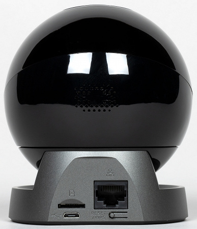 Все интерфейсы камеры вынесены наружу и находятся на задней стороне основания: слот карты памяти, разъем питания Micro-USB, LAN-порт и кнопка сброса к заводским установкам.