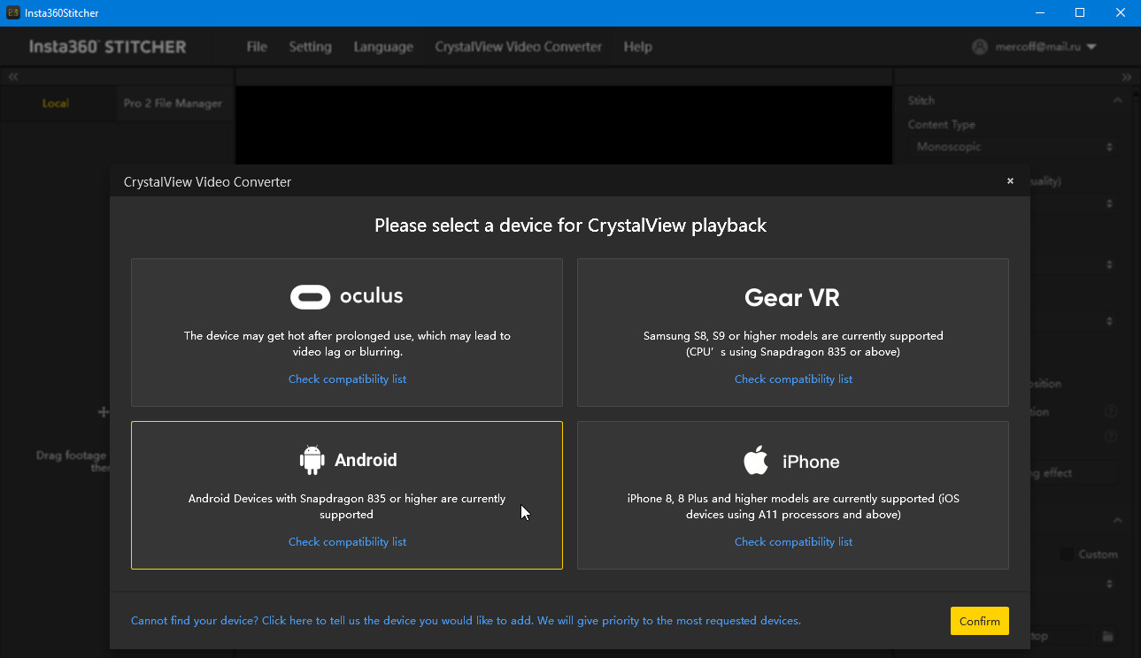 Помимо локального просмотра на ПК, разработчик предоставил возможность просмотра роликов с разрешением до 8К на мобильных устройствах. Для этого используется фирменное приложение Insta360 Moment. Но есть один минус: для того, чтобы данное приложение «увидело» панорамный ролик, его необходимо перекодировать в специальный формат с расширением .VRB. Это делается непосредственно в программе Insta360 Stitcher. Здесь, в модуле CrystalView Video Converter, необходимо выбрать платформу, на которой будет воспроизводиться видео, после чего запустить кодирование заранее «сшитого» панорамного ролика.
