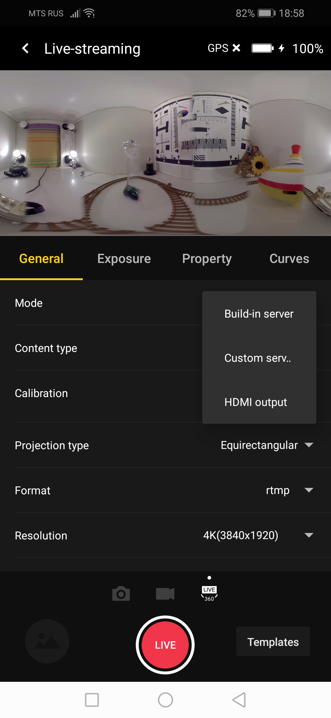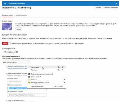 Камера Insta360 Pro 2, как и предыдущая версия аппарата, может использоваться не только для автономной записи с последующей обработкой полученного материала и выгрузкой его на какие-то сервисы. Вторая (не по важности, а по счету) функция камеры — это прямая трансляция. Она возможна как по локальной сети, так и через HDMI-видеовыход. Оба способа трансляции допускают передачу видеопотока с максимальным размером кадра 3840×2160 в любом из представленных в камере режимов, включая 3D.