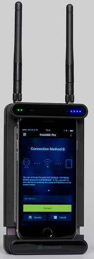 Процесс сопряжения камеры, передатчика и приемника несложен, хотя и может занять минуту-две. Включив камеру с подключенным к ней передатчиком, следует дождаться получения камерой IP-адреса, который высветится на ее дисплее. Теперь нужно включить приемник, а на подключенном к нему смартфоне запустить приложение Insta360 Pro, выбрать метод связи A (Connection Method A) и вписать IP-адрес в соответствующее поле. Если последовательность действий не нарушена, то соединение обязательно состоится.
