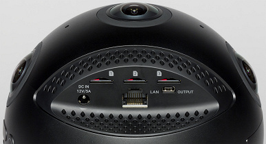Эти шесть слотов для карт памяти предназначены для раздельной записи материала с каждой из шести объективов. Из-за обилия новых интерфейсов можно считать, что перед нами фактически другая камера, просто в корпусе похожей формы. Но ведь другую форму придумать непросто: будь камера кубической формы, охват шестью объективами 360-градусной панорамы не обеспечишь.
