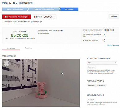 Во время трансляции зрители могут изменять направление взгляда мышкой, точно так, как это делается при просмотре обычных, заранее «залитых» на YouTube, панорамных видеороликов. Вместе с видеопотоком поступает и звук, а задержка сигнала в нашем случае составила около 20 секунд.