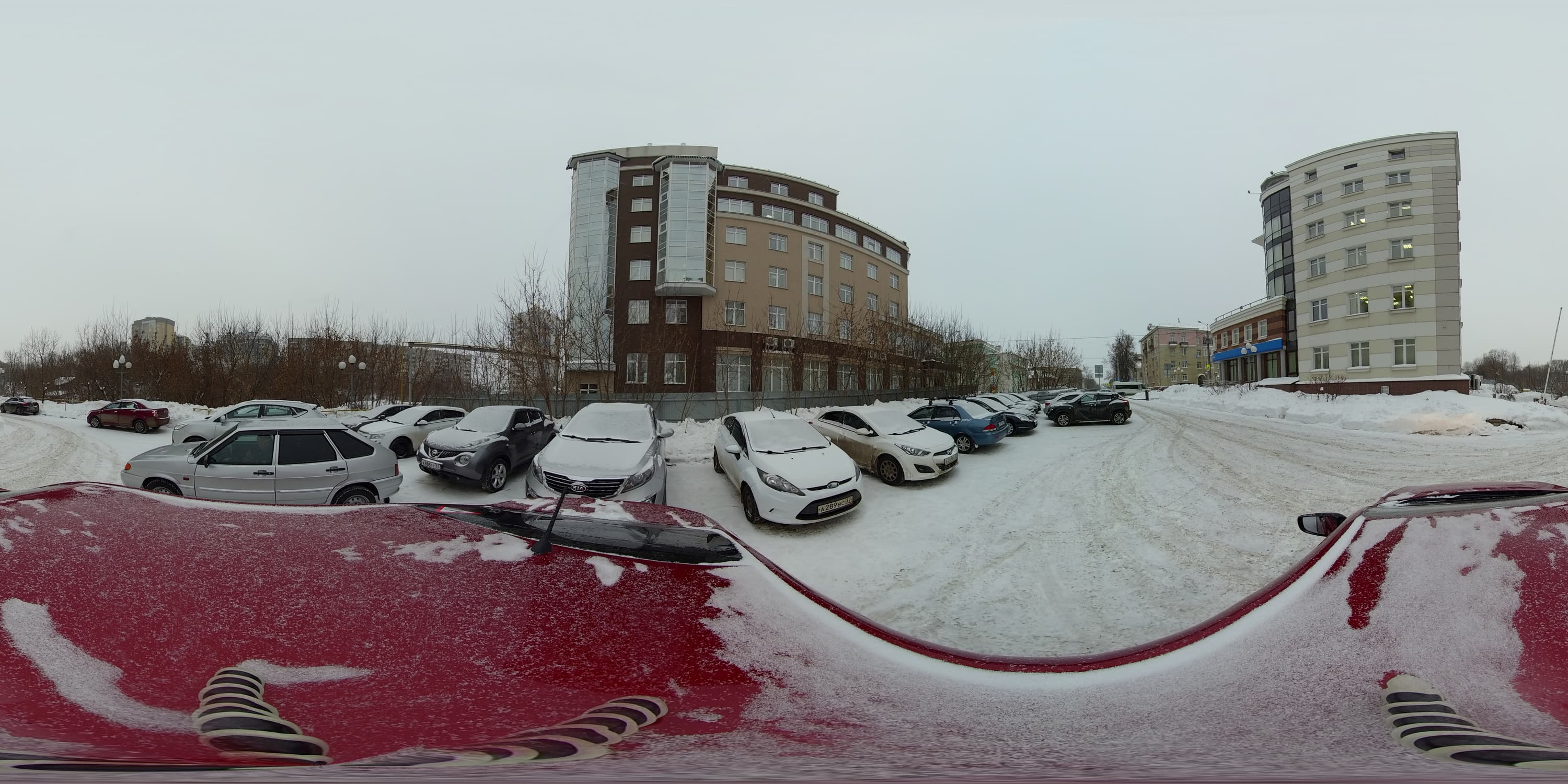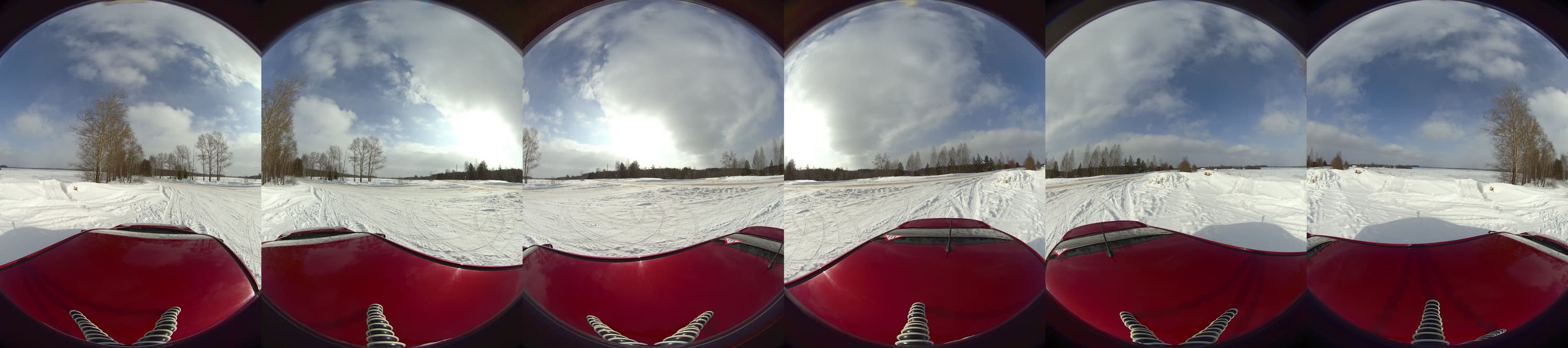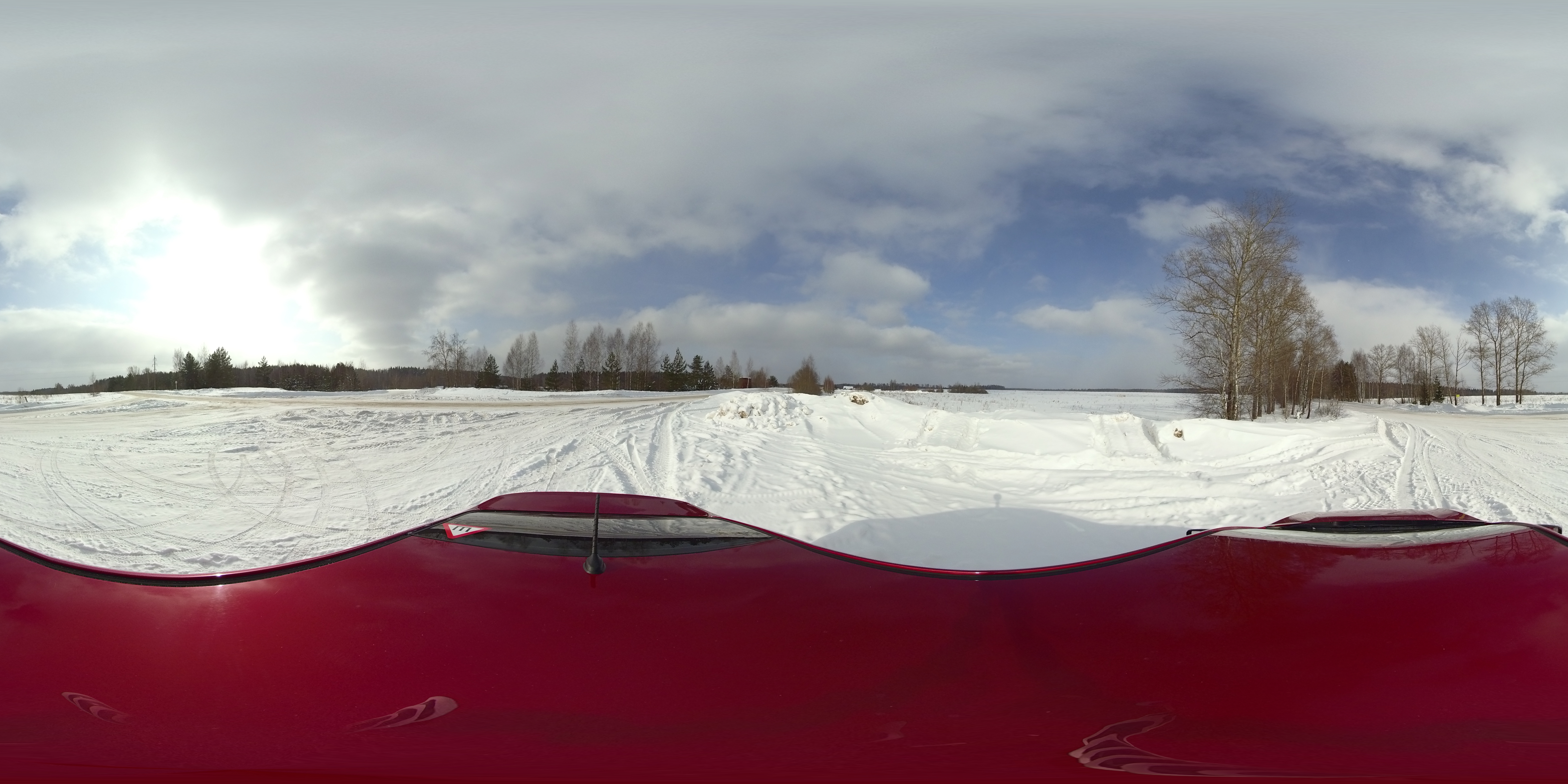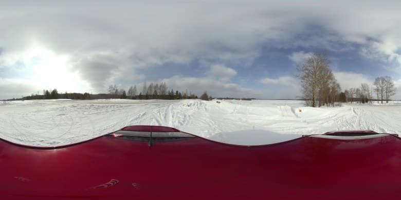 Для дневной интервальной съемки камера была установлена на крышу автомобиля. Также была задействована специальная поворотная площадка (фотографы знают о существовании таких площадок — с их помощью камера в течение заданного времени совершает поворот вокруг оси). Зачем нужна эта площадка, ведь готовую панораму во время просмотра можно повернуть как угодно — мышкой, пальцем или движением головы (зависит от способа просмотра)? Очень просто: хотелось, чтобы живая панорама вращалась сама. Задумка-то, может, и хорошая... Однако через десять минут после начала съемки механизм поворотной площадки, по всей видимости, замерз, и вращение прекратилось.