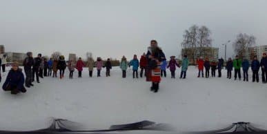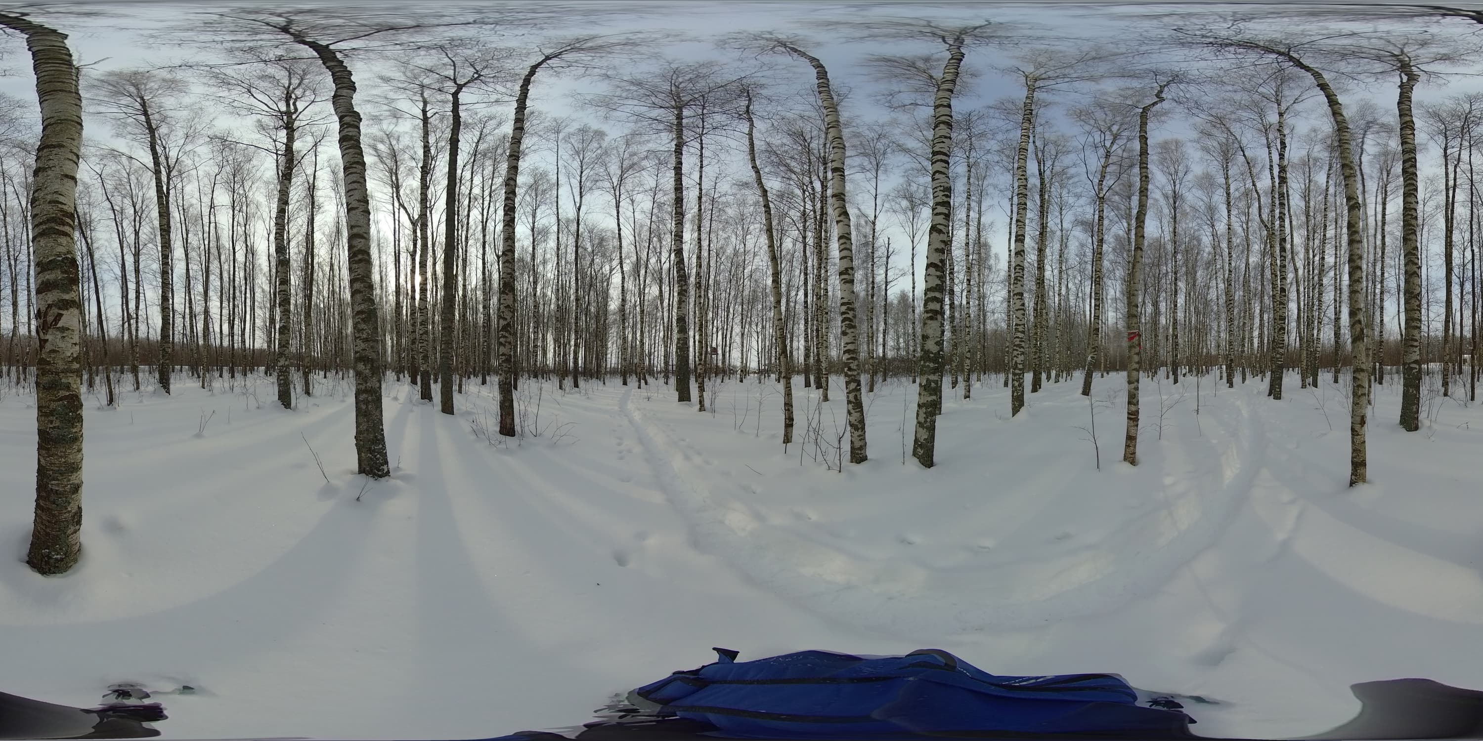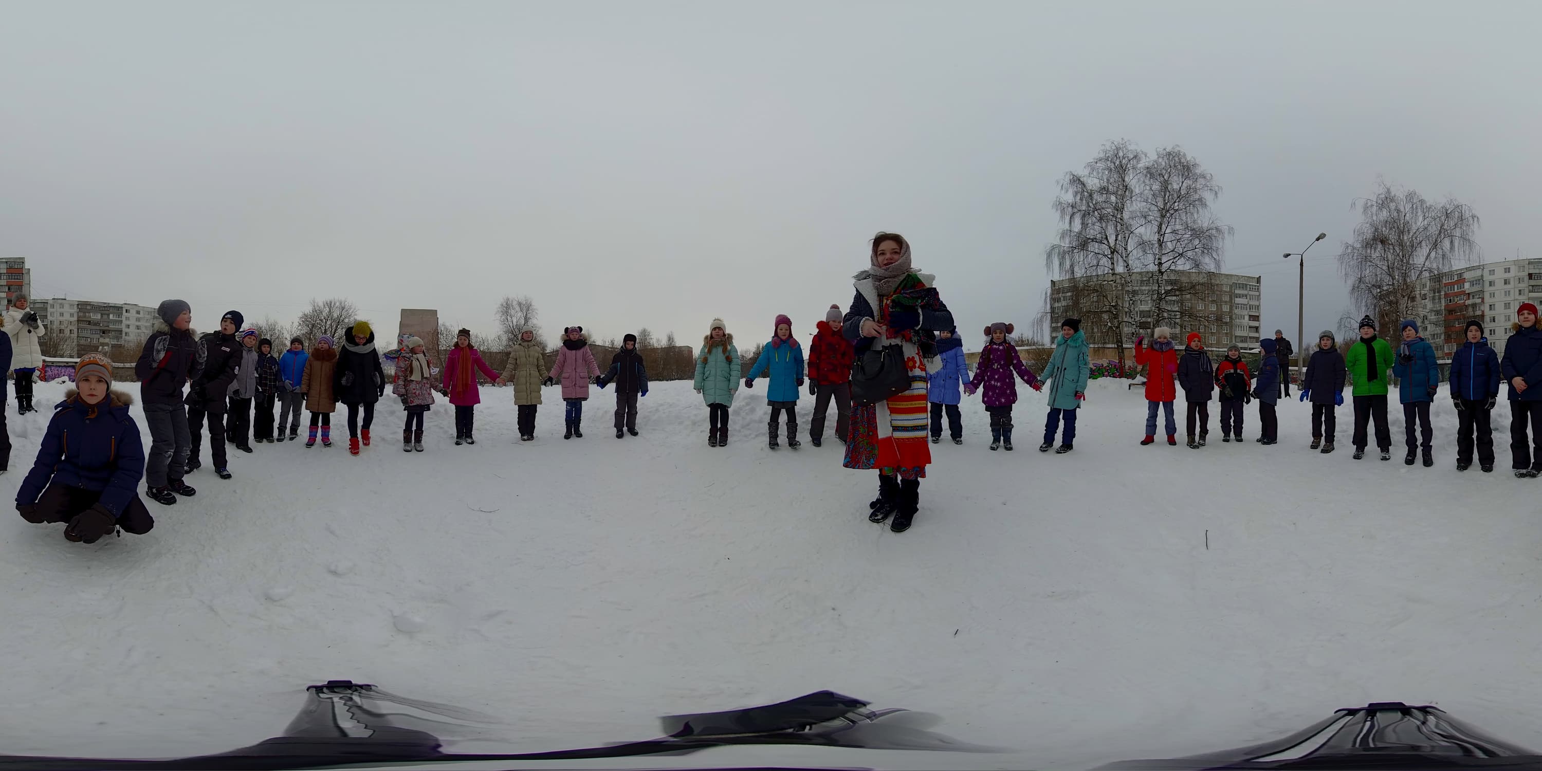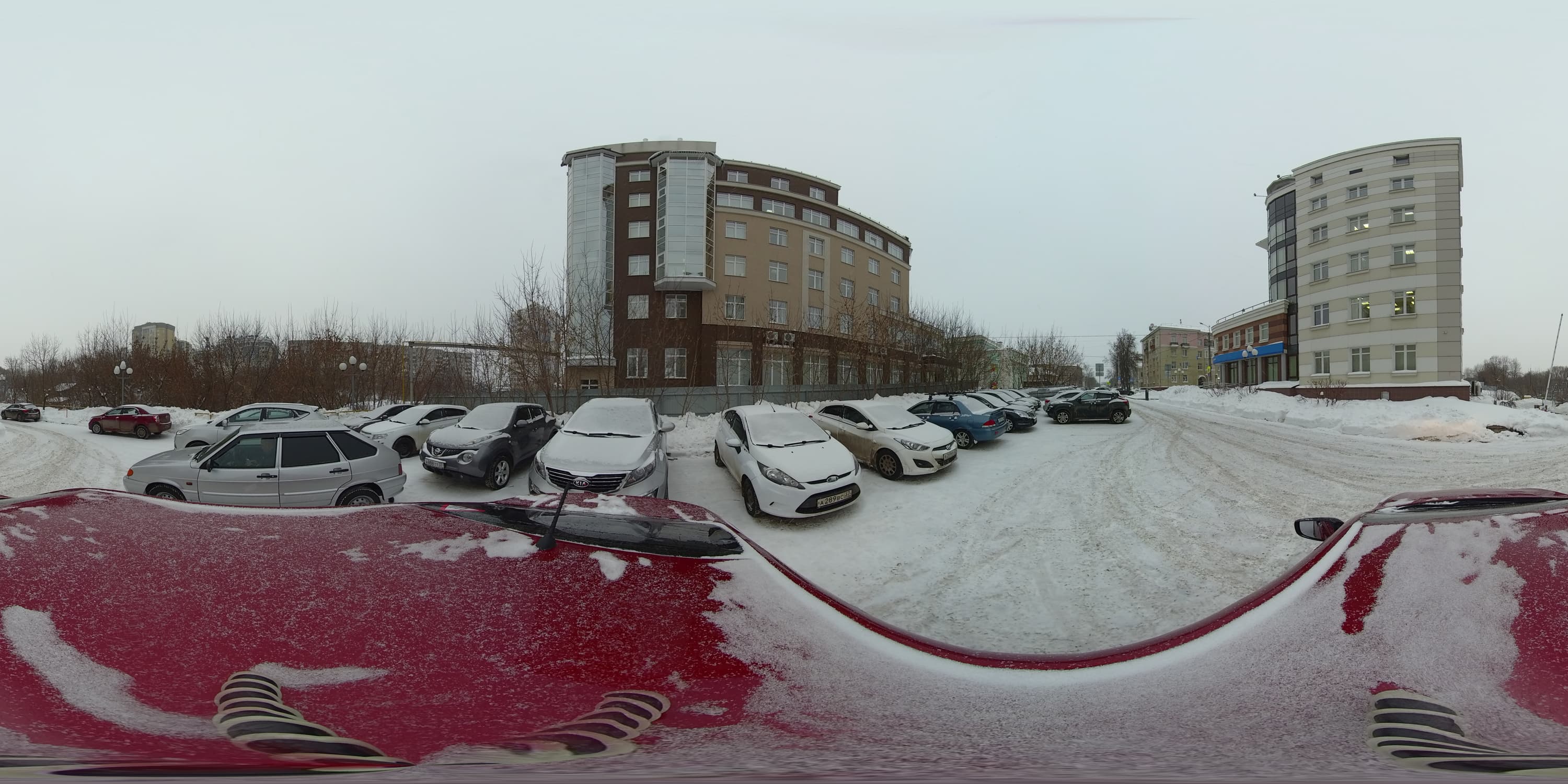 Для дневной интервальной съемки камера была установлена на крышу автомобиля. Также была задействована специальная поворотная площадка (фотографы знают о существовании таких площадок — с их помощью камера в течение заданного времени совершает поворот вокруг оси). Зачем нужна эта площадка, ведь готовую панораму во время просмотра можно повернуть как угодно — мышкой, пальцем или движением головы (зависит от способа просмотра)? Очень просто: хотелось, чтобы живая панорама вращалась сама. Задумка-то, может, и хорошая... Однако через десять минут после начала съемки механизм поворотной площадки, по всей видимости, замерз, и вращение прекратилось.