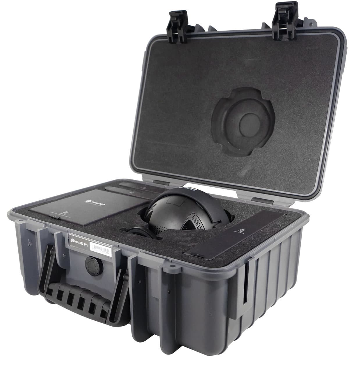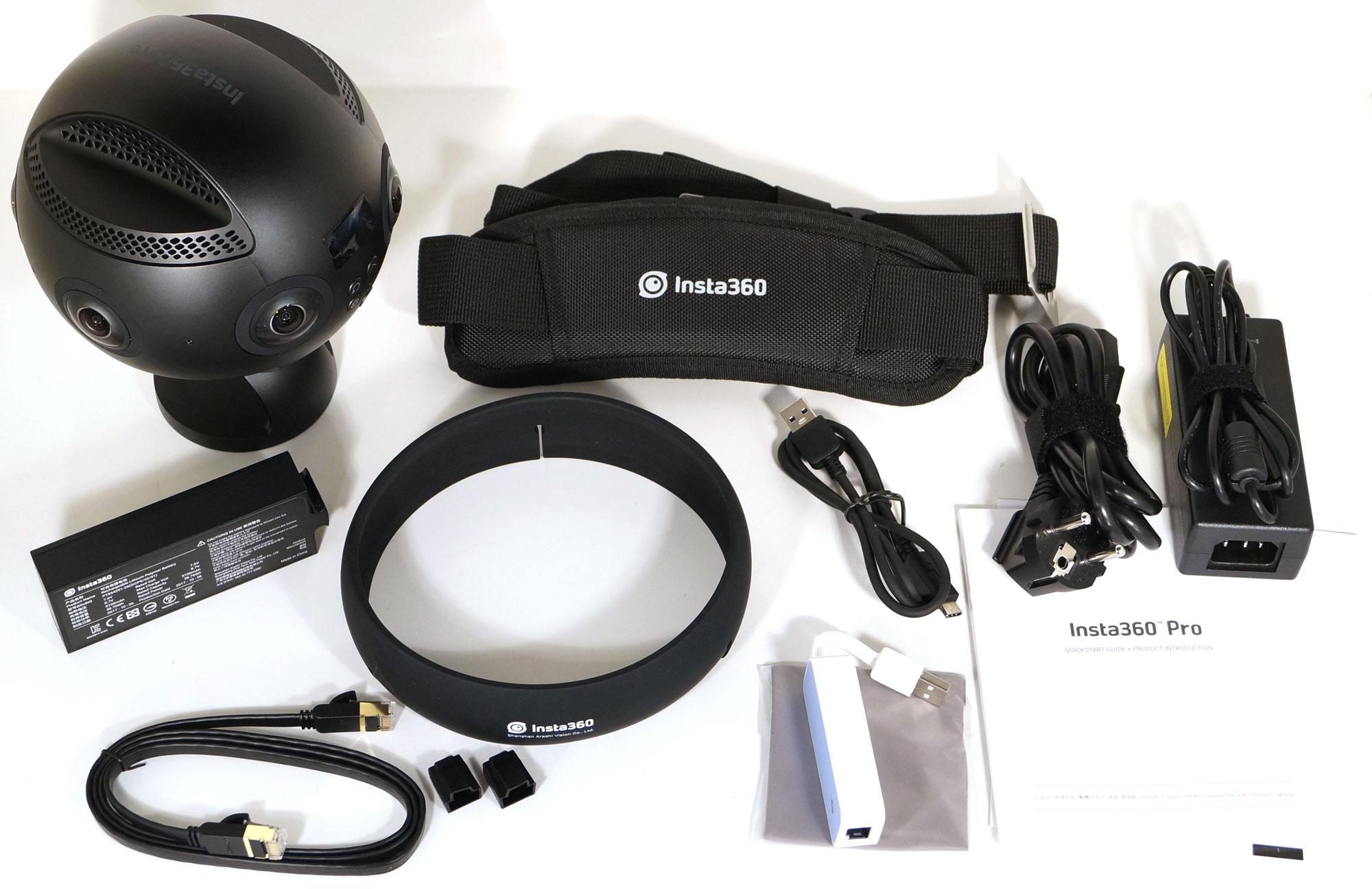 Комплектность набора состоит из камеры Insta360 Pro, аккумулятора емкостью 5000 мА·ч, Ethernet-адаптера (100 Мбит/с) для интерфейса USB 2.0, сетевого адаптера питания с силовым кабелем, резиновой защитной кольцевой накладки для линз, наплечного ремня для переноски кейса, LAN-кабеля с наконечниками-заглушками, кабеля USB Type-C, салфетки для протирки стекол объективов и краткого руководства пользователя.