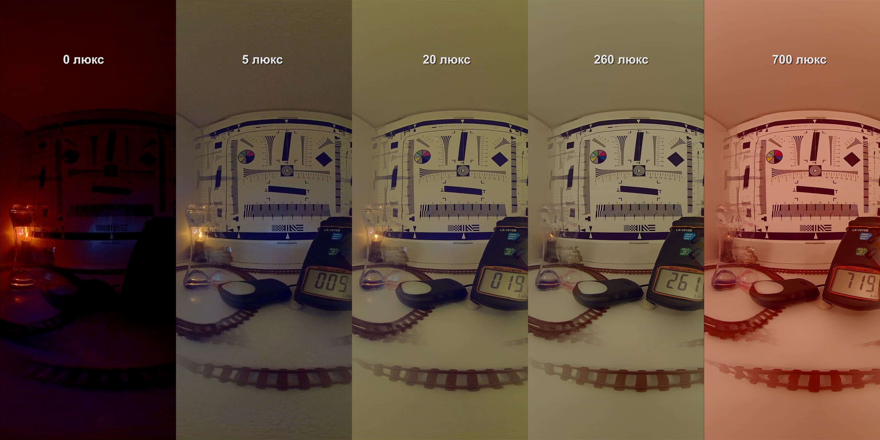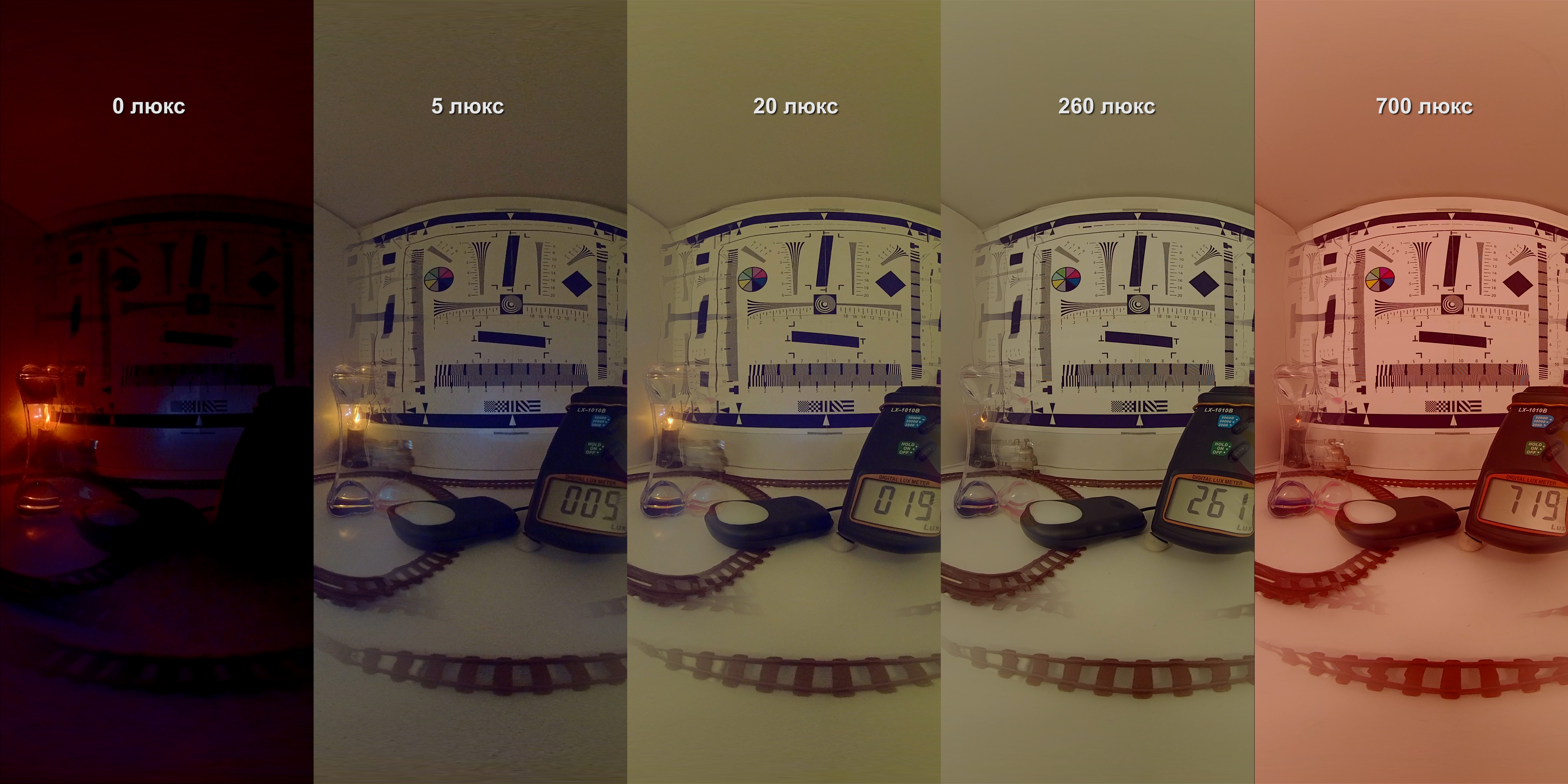 На следующем стоп-кадре, который склеен из нескольких съемок, можно следить за поведением автоматики камеры на разных уровнях освещенности. Так, с нулевого уровня до уровня в 20 люкс картинка испещрена шумом — это совершенно нормальное для большинства камер поведение, которое означает, что светлый кадр достигается при помощи усиления. Однако уже на 260 люксах шум исчезает, а это доказывает, что камере при такой освещенности хватает имеющейся чувствительности для фиксации изображения без активации усиления.