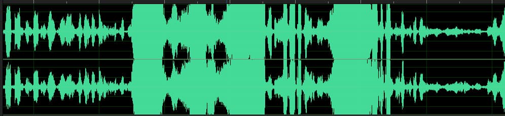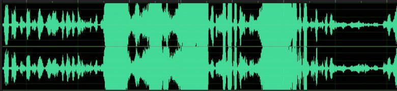 Примерно так выглядит звук этого ролика в аудиоредакторе: очевиден гигантский клиппинг, исправить который чрезвычайно трудно. Банальным снижением уровня тут не обойтись, ведь обрезанные верхушки синусоид останутся обрезанными. Чтобы хоть как-то уменьшить эти хриплые перегрузки, требуется очень качественный de-clipper с тщательной настройкой.