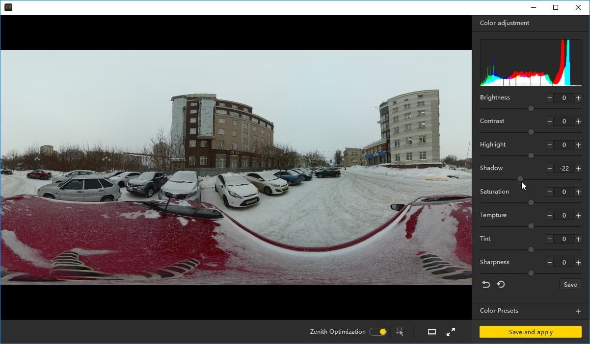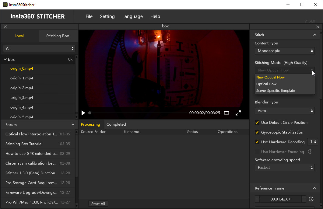 В процессе обработки контента в программе Insta360 Stitcher пользователь может выбрать метод склейки, изменить яркость/контрастность и другие параметры изображения. Программа умеет склеивать панорамы в пакетном режиме. Процесс склейки видеопанорам происходит небыстро, особенно если выбран метод сшивания не по умолчанию, а Optical Flow. Эта технология используется во многих других программах, которые предназначены для создания панорам из нескольких фотоснимков. С помощью оптического распознавания объектов программа склеивает кадры в одно целое, пример ее работы был показан ранее. Анализируя каждый кадр со всех шести камер, Insta360 Stitcher одновременно сохраняет результат с помощью одного из выбранных кодеков, H.264 или H.265. Еще раз заметим: процесс этот долгий, наш ПК с процессором Intel Core i7-3970X работал почти полчаса над склейкой видеопанорамы длительностью три минуты. Здесь-то и пригодится возможность пакетной обработки сразу нескольких роликов: отправив файлы в очередь и запустив процесс, пользователь может спокойно заняться другими делами.