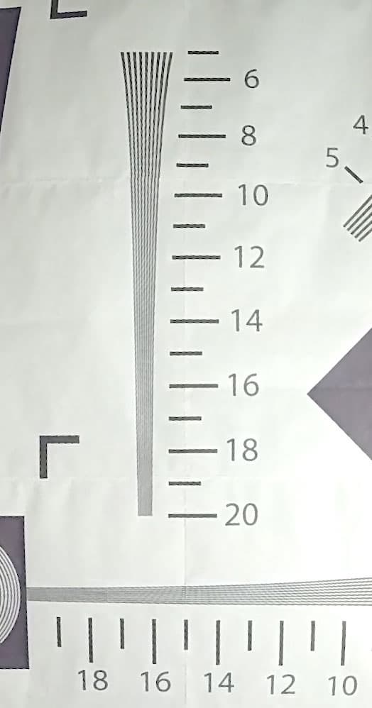 В результате измерений был получен довольно высокий результат: около 1500-1600 ТВ-линий. Такую разрешающую способность дает не каждая 4K-камера. Если увеличить контрастность, то можно разглядеть и большее разрешение, однако это будет уже искусственное подтягивание действительного к желаемому.