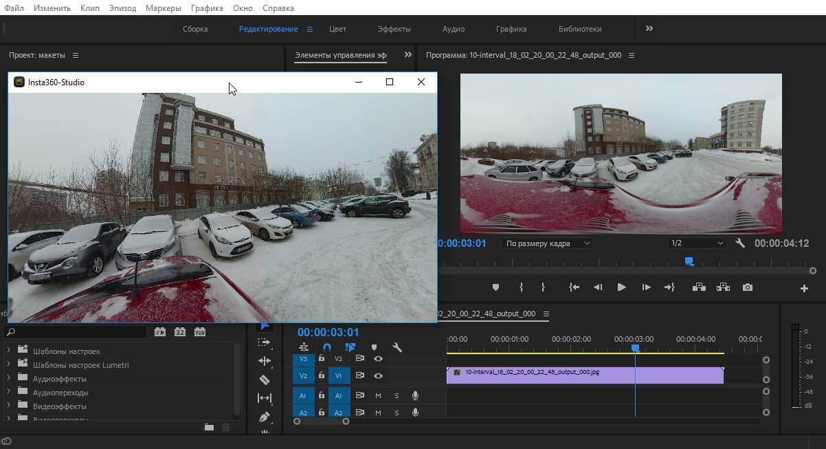 Между прочим, Premiere Pro мы упомянули не зря. Разработчик Insta360 Pro создал даже специальный плагин для этой программы монтажа. Активированный плагин создает дополнительное масштабируемое окно, в котором отображается обрабатываемое видео. И не просто отображается. Здесь видео можно повернуть в любую сторону, как это делается на YouTube и в каждом панорамном плеере.