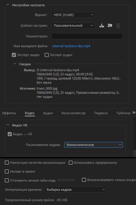 Что касается сохранения видео в формате панорамы — здесь тоже нет ничего сложного. Так, при экспорте из Premiere Pro достаточно отметить флажком пункт Video — VR, и в финальный файл будет внедрен специальный тег, который распознается панорамными проигрывателями, в том числе YouTube.