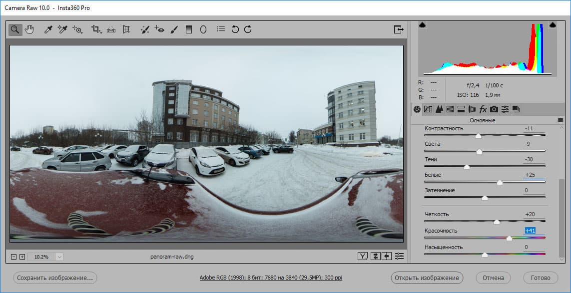 Умеет камера сохранять фотопанорамы и в RAW-формате (стандартный DNG), который впоследствии можно «раскрасить» как угодно.