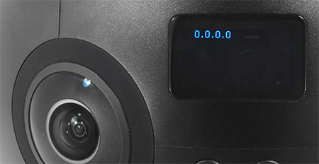 «Передняя» или «задняя» части в камере отсутствуют, как отсутствуют в невесомости понятия «верх» или «низ». Для удобства передней частью камеры мы посчитали ту, где находится миниатюрный матричный дисплей и механические кнопки управления камерой. Шесть объективов, расположенные по экватору сферы, обеспечивают полный обзор во всех направлениях. Между объективами виднеются мелкие объекты — это встроенные микрофоны, а заодно и трехцветные светодиоды, утопленные в корпус и сигнализирующие о текущем состоянии камеры: например, мигание белым цветом означает нормальный ход видеозаписи, а постоянное свечение красным цветом предупреждает о скором разряде батареи.