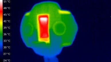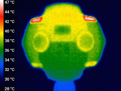 Следующие теплоснимки и тепловидеозапись сделаны после трех последовательных (один за другим) 15-минутных периодов видеозаписи в режиме 8K 30p, тестирование производилось в помещении с температурой около 25-26 °C. Таким образом удалось максимально нагреть видеокамеру, поскольку в перерывах мы не давали ей охладиться, а практически сразу включали следующую 15-минутную запись. Важное замечание: повторять такие «подвиги» не рекомендуется.