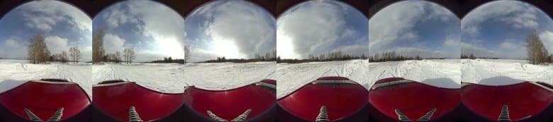 Однако если просто составить эти кадры вместе, как на схеме выше, то получится совершенно непригодная для использования картинка. Взглянем, как эта склейка без специальной обработки будет выглядеть на примере интервальной съемки, в которой оригинальные фото с каждой из шести камер имеют размеры 4000×3000 пикселей. Составленные вместе, они частично повторяются, что неприемлемо для финального результата в виде сферической панорамы (осторожно, по щелчку на миниатюре откроется полноразмерное 72-мегапиксельное изображение).