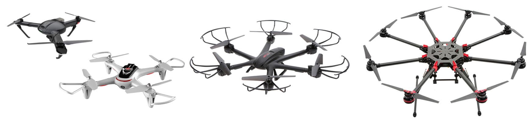 Такая популярность объясняется четырехлучевой конструкцией, которая оказалась оптимальной по цене и сложности изготовления. Она позволяет переносить небольшие грузы (в большинстве случаев — мини-камеру), обеспечивая при этом неплохую динамику подъема и перемещения. С длительностью пребывания в воздухе у них всё тоже обстоит неплохо: некоторые модели могут летать до получаса без подзарядки или замены аккумулятора. Но конечно же, их функциональность, а значит, и возможности коптера, сильно зависит от цены. Которая может отличаться на порядки.