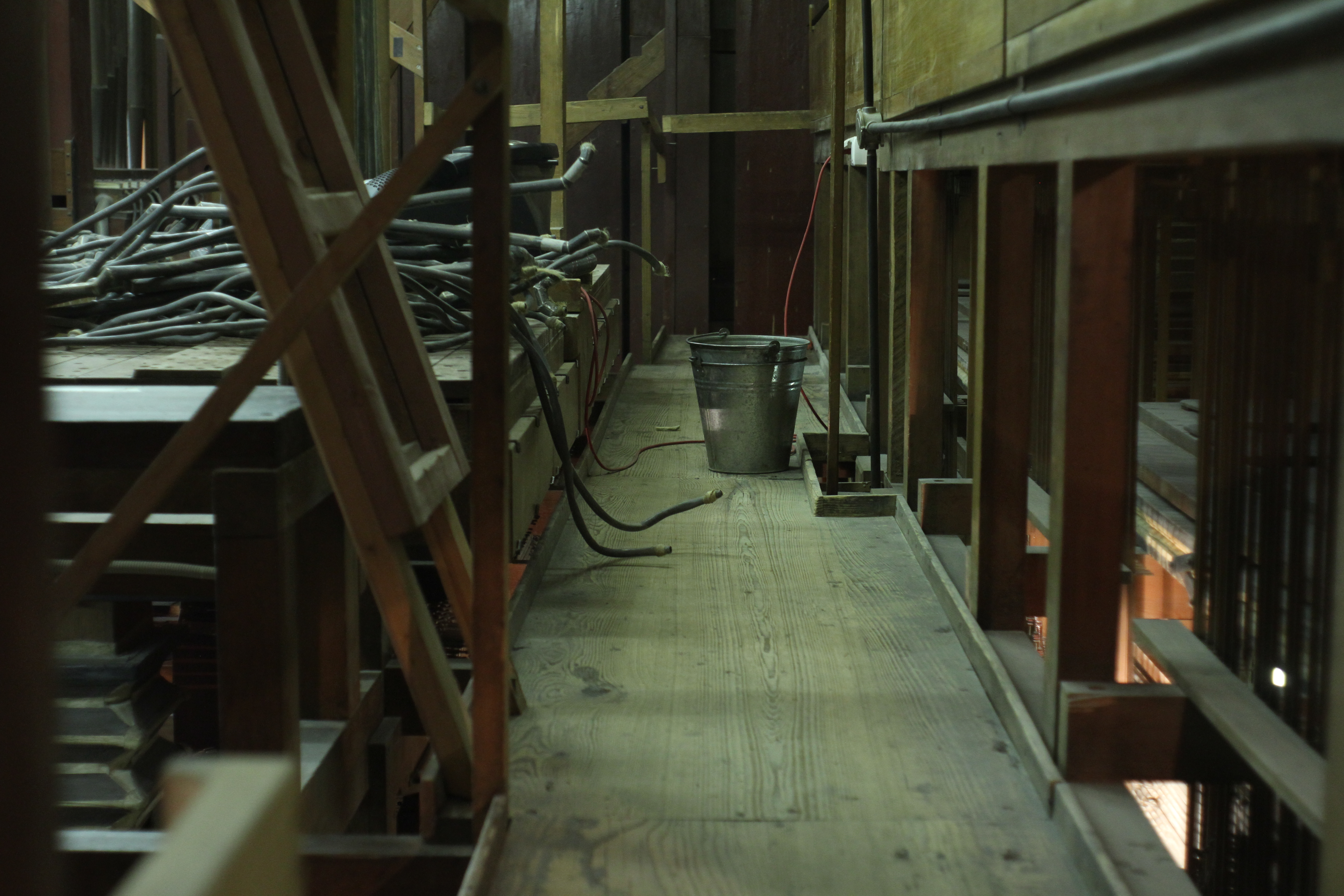 И вторая проблема: использовать дополнительное освещение типа больших студийных ламп в орга́не категорически нельзя. Во-первых, они туда просто не поместятся, а во-вторых, любой перегрев чреват возгоранием. И учитывая, что вся основа инструмента деревянная, никакая противопожарная система не спасет.
