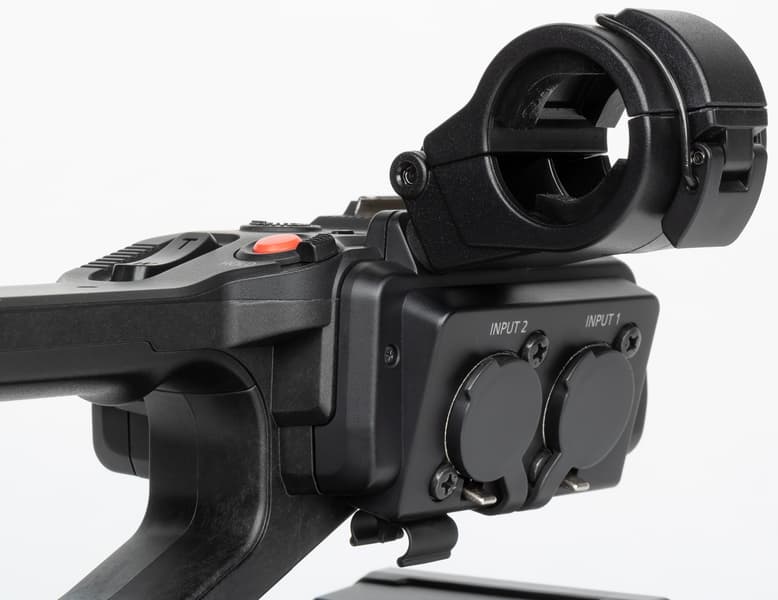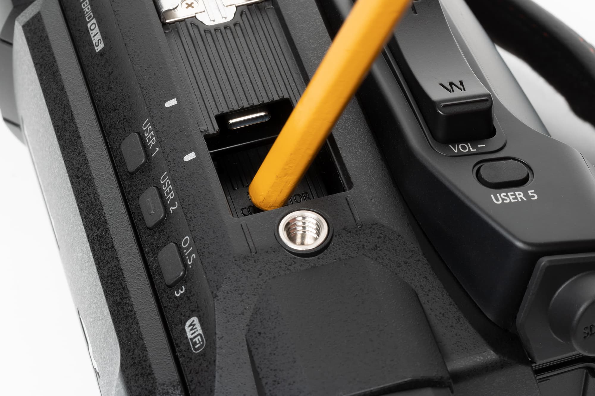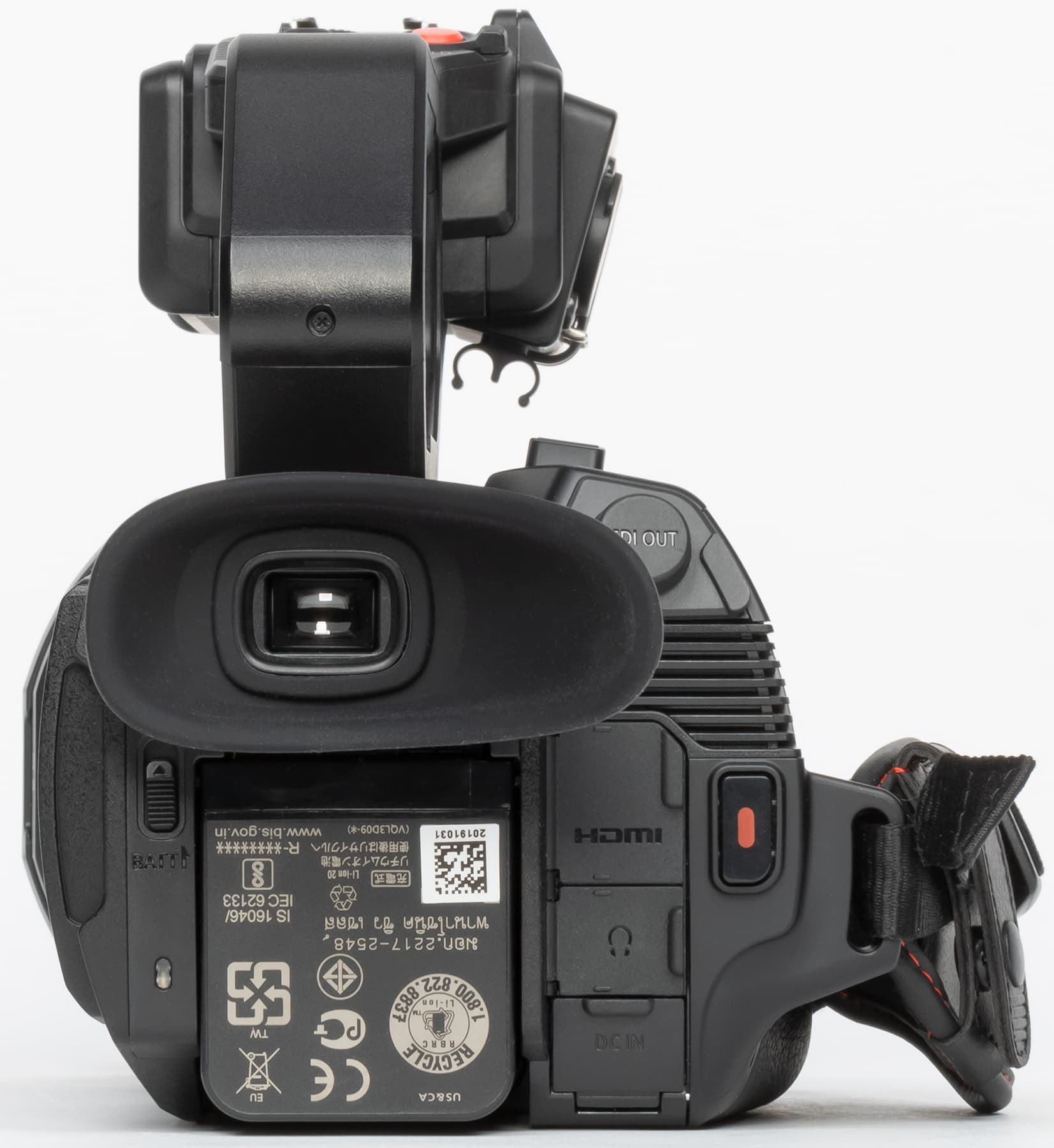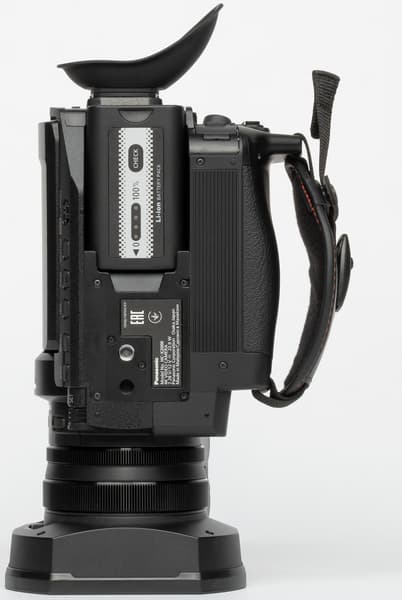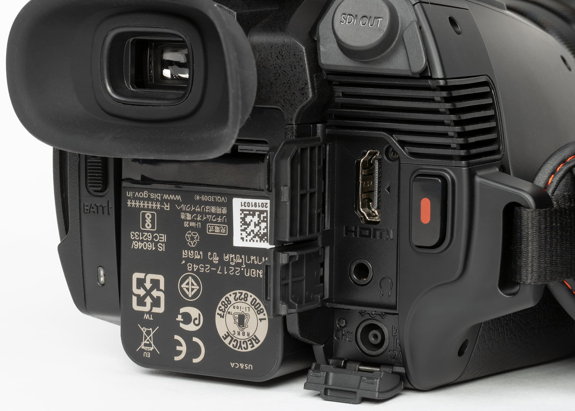 Часть интерфейсов запрятана под откидными крышками в торце корпуса: полноразмерный HDMI выход 2160 60p, 3,5-миллиметровый аудиовыход на наушники и разъем для подключения адаптера питания для зарядки аккумулятора или для работы напрямую от сети. Чуть выше, под отдельной крышкой, находится видеовыход SDI (Serial Digital Interface) — профессиональный цифровой видеоинтерфейс, с максимальным разрешением 1080 60p.