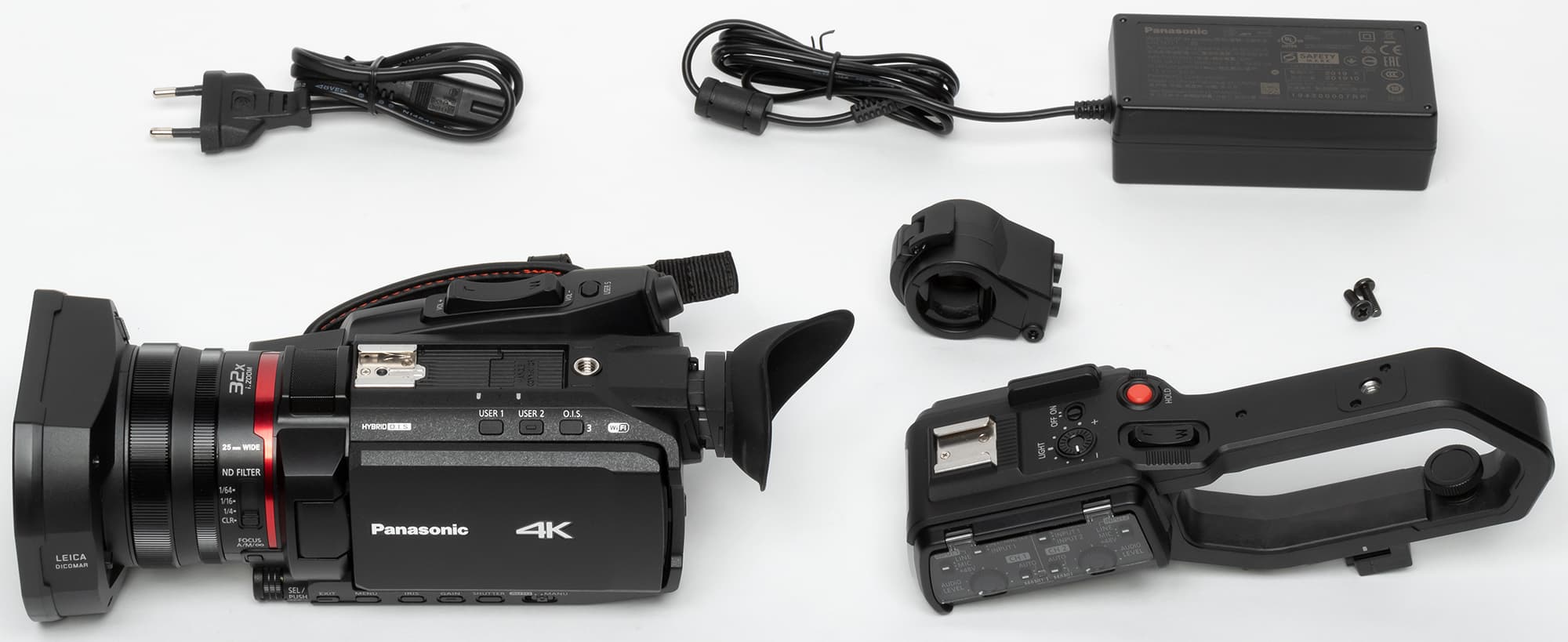 Комплект поставки зависит от модели камеры. Для «старшей» модели, Panasonic HC-X2000, этот комплект выглядит так: