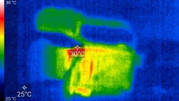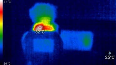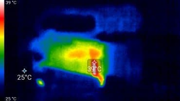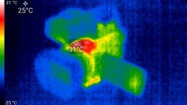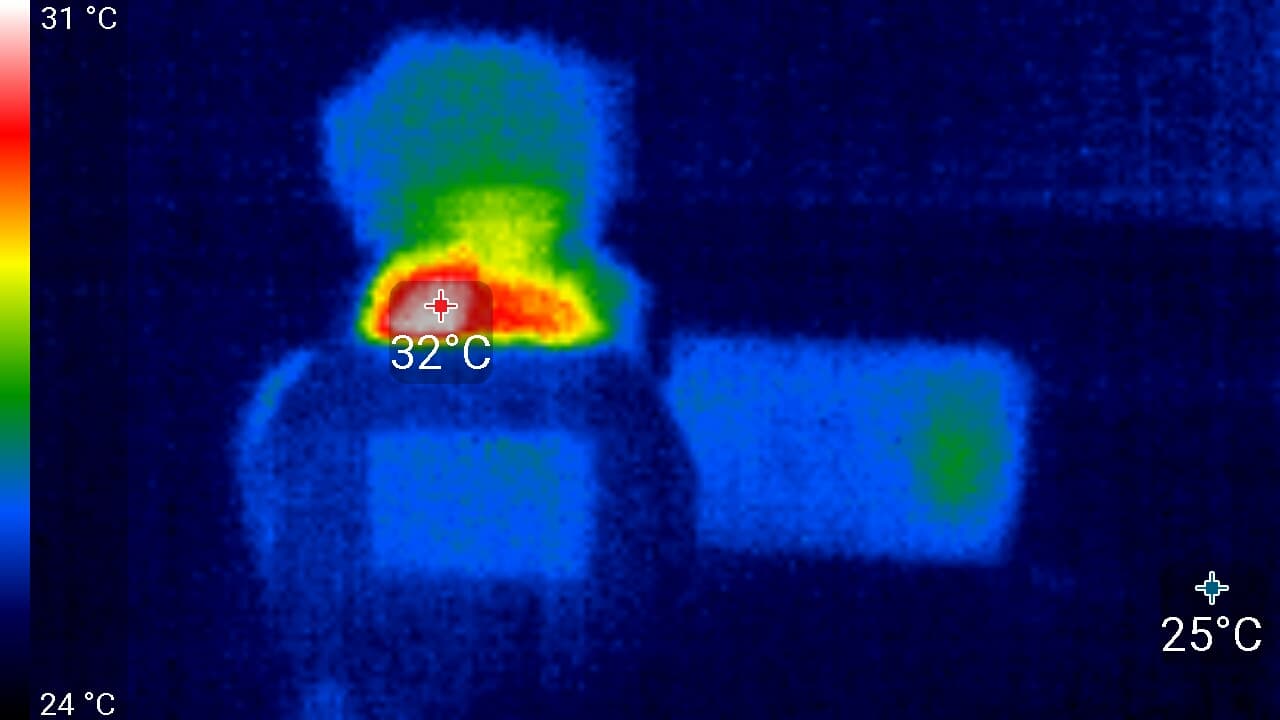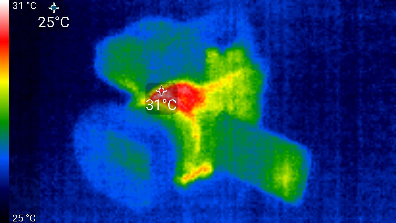 На снимках видно, что рассматриваемая камера относится к классу холоднокровных не нагревающихся аппаратов: риск получить перегрев при длительной работе или при съемке в жарких условиях практически отсутствует. Тепловизор с трудом различает камеру на фоне теплого окружения, температура которого почти идентична температуре корпуса аппарата. Самый высокий нагрев наблюдается в зоне выброса отработанного воздуха, да и тот достигает лишь 39 °C, что абсолютно безопасно для любой электроники.