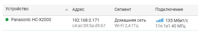 Камера, подключенная к роутеру, устойчиво держит связь на скорости, близкой к максимальной. На следующем скриншоте можно видеть камеру в списке подключенных устройств, сама камера при этом находится в другой комнате.