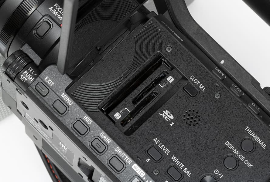 Камера оснащена двумя слотами для карт памяти формата SD/SDHC/SDXC. Слоты могут работать в двух режимах: одновременной записи или эстафетной. Также можно записывать в любой из слотов «на заказ», для выбора слота предусмотрена отдельная кнопка.