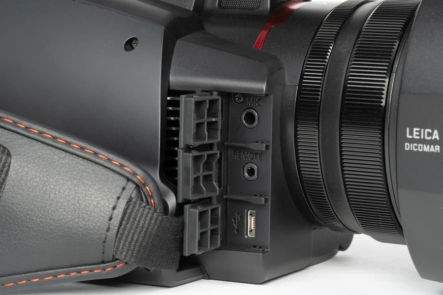 Прочие разъемы расположены под такими же крышками, но ближе к объективу: 3,5-миллиметровый микрофонный вход, разъем для подключения проводного пульта ДУ, а также интерфейс Micro-USB для подсоединения к ПК для копирования материала с карт памяти.