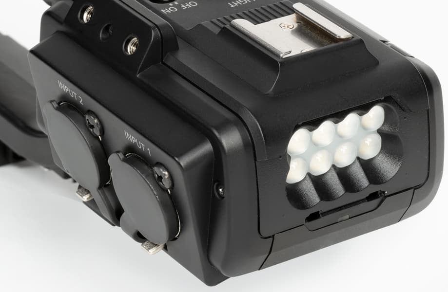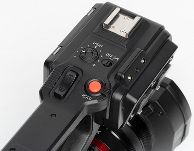 Сверху на рукоятке находится качалка зума, кнопка записи с поворотным фиксатором, дополнительный «холодный башмак», а также переключатель встроенной подсветки и «блинчик» для настройки яркости светодиодов.