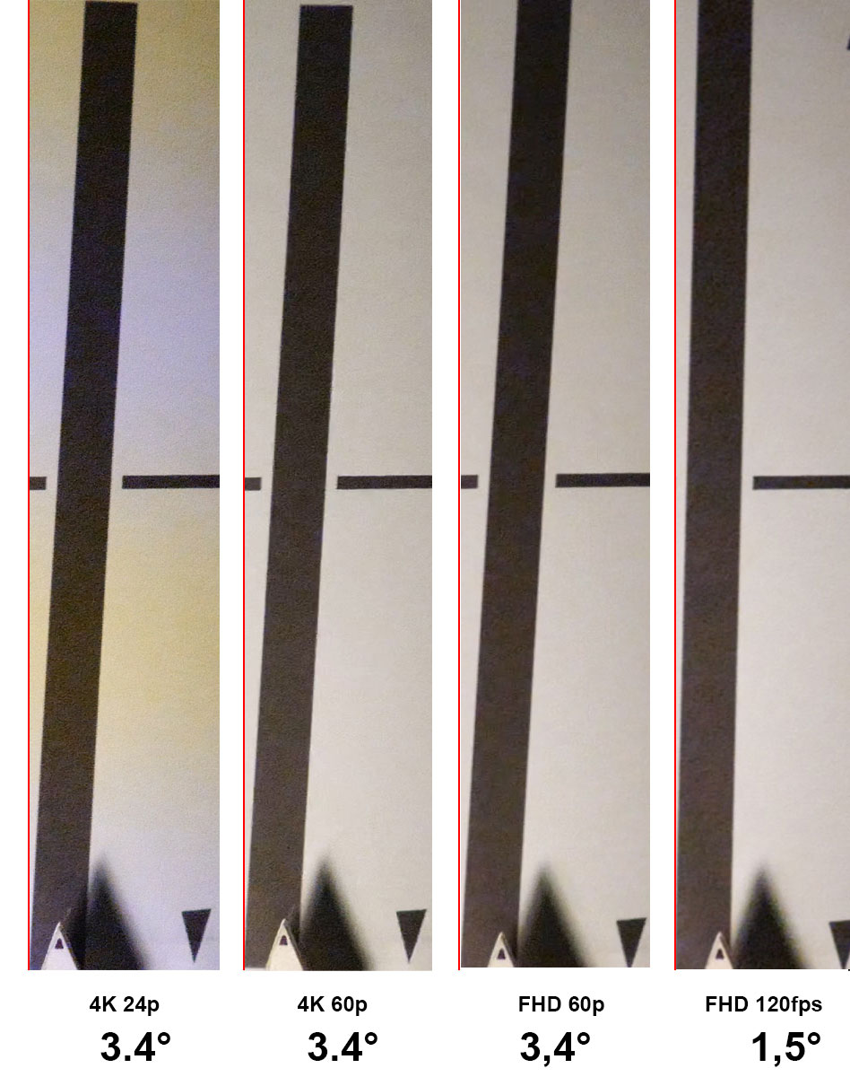 Вот с роллинг-шаттера мы и начнем. Главный признак роллинг-шаттера (подробнее см. в материале Роллинг-шаттер в видеосъемке — описание дефекта, примеры, пояснения) — это наклон вертикалей. Наклон несложно определить с помощью нашего специального стенда, в котором на вращающемся с постоянной скоростью (78 об/мин) цилиндре нанесена вертикальная метка. Измерение показало, что рассматриваемая камера дает максимальный наклон 3,4° в любом режиме съемки, от 4K 60p до 1080 60p. Отдельного внимания удостаивается скоростной режим съемки, где наклон падает до практически незаметных 1,5°.