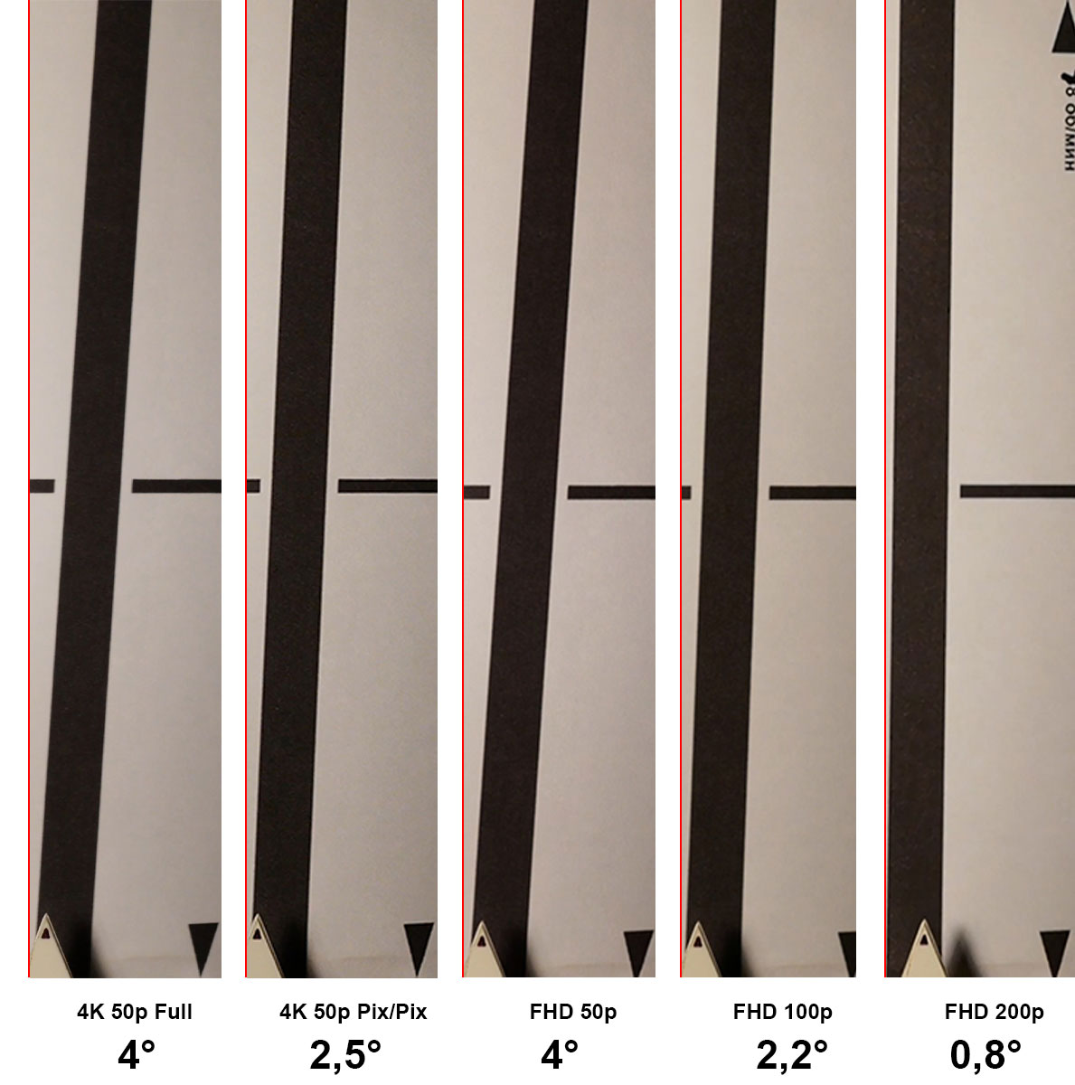 Измерение показало, что в рассматриваемой камере роллинг-шаттер дает максимальный наклон в 4° в режиме съемки 4K 50p. Если переключить камеру в режим съемки пиксель-в-пиксель, то наклон уменьшается до 2,5. Это объясняется тем, что в режиме пиксель-в-пиксель сканируется меньшая площадь сенсора, а значит, на сканирование затрачивается меньшее время. В Full HD-съемке, помимо режима пиксель-в-пиксель, можно увеличить частоту кадров до 100 и даже до 200 в секунду. Минимальный наклон вертикалей (а значит, и степень роллинг-шаттера) дает съемка в Full HD с частотой 200 кадров в секунду. Здесь наклон составил менее одного градуса.