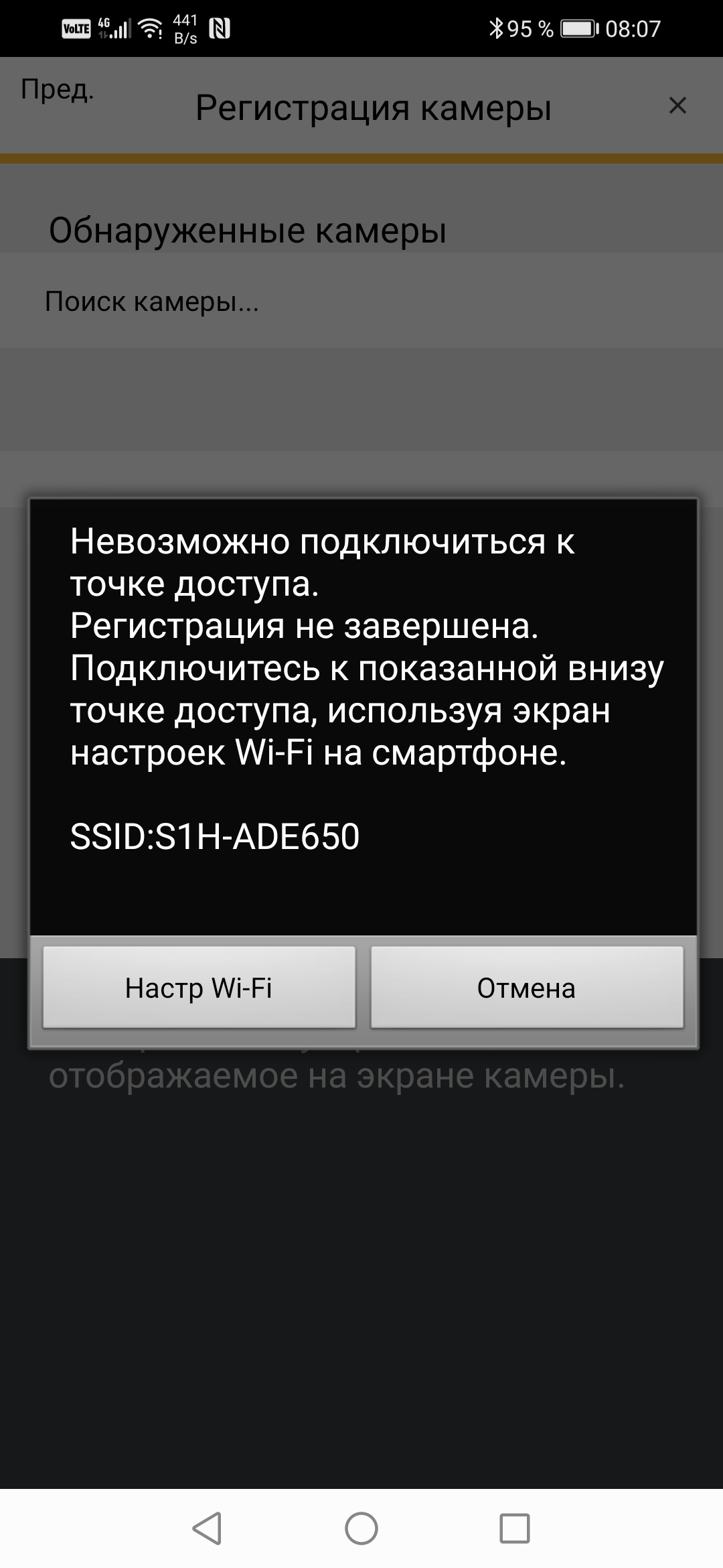 Неясно, в чем тут проблема. Возможно, версия Bluetooth на нашем смартфоне недостаточно продвинутая. Но не беда, есть и другой способ: можно принудительно активировать Wi-Fi точку камеры и вручную подключить к ней смартфон, после чего запущенное приложение самостоятельно зарегистрирует камеру.