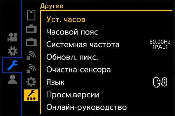 Системные настройки позволяют отформатировать карты памяти, определиться с методом записи на них, изменить частоту кадров, яркость и другие параметры монитора и видоискателя, выбрать функции соединения по кабелю, Wi-Fi и Bluetooth, сохранить или загрузить пользовательские настройки аппарата.