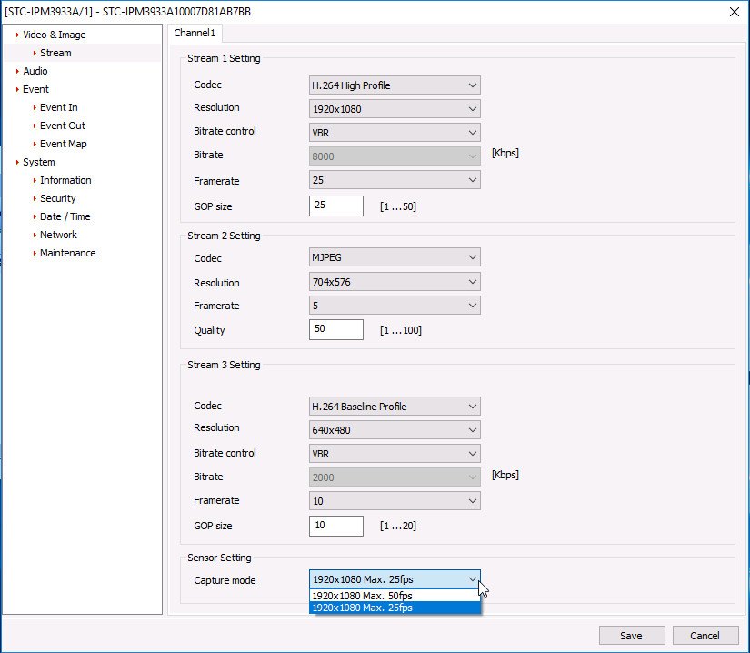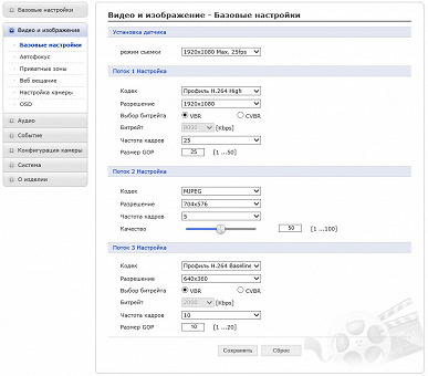Много внимания в настройках камеры уделено характеристикам изображения. Эти характеристики зависят от множества параметров: кодека, размера и частоты кадров, битрейта и даже размера GOP (Group Of Pictures — интервал между ключевыми кадрами). Также можно изменить и метод сжатия видеопотока, выбрав постоянный либо переменный способ распределения битрейта. Камера всегда формирует три разных потока, отключить какой-то из них нельзя. Каждый поток имеет свои собственные настройки, в некоторых случаях они зависят от настроек соседнего потока. Первый и третий потоки всегда транслируются с кодеком H.264, а поток №2 работает только с MJPEG, который нужен для совместимости с некоторыми браузерами и/или рекордерами.