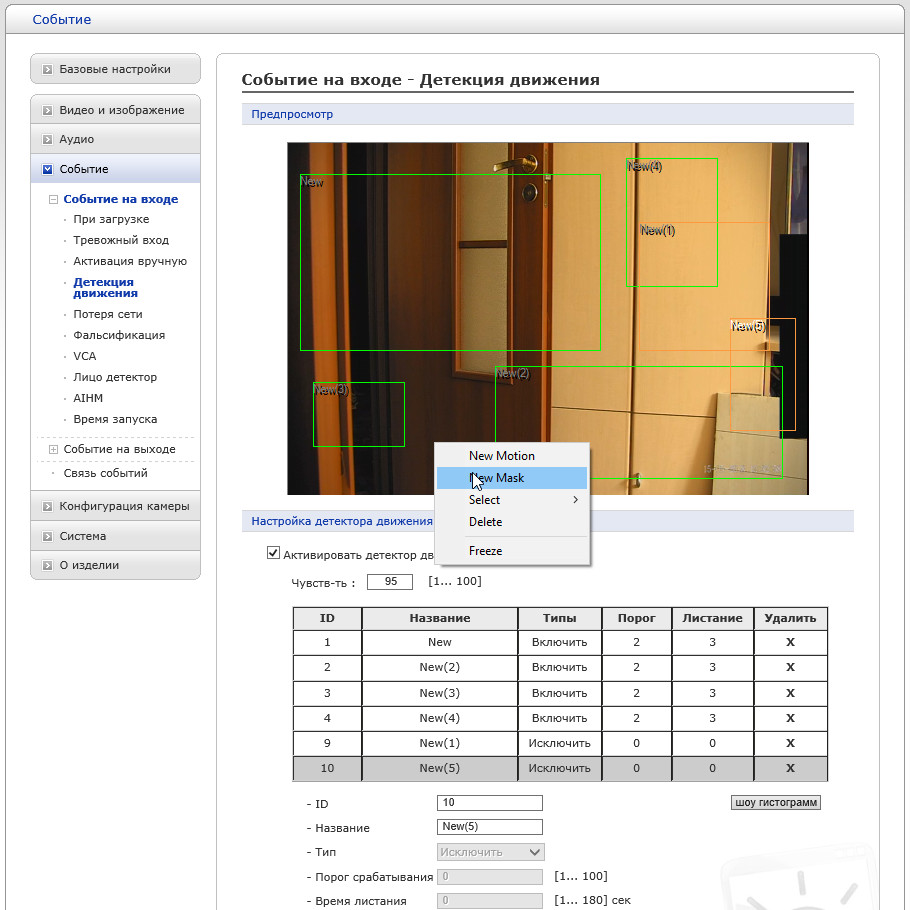 О детекторе движения следует рассказать чуть подробнее. Этот модуль разрешает создавать не только зоны, за которыми камера должна наблюдать (рамки зеленого цвета), но и зоны, детектирование движения в которых не требуется (оранжевая рамка). Для каждой зоны предусмотрены свои, уникальные настройки чувствительности и даже продолжительности обнаруженного движения.